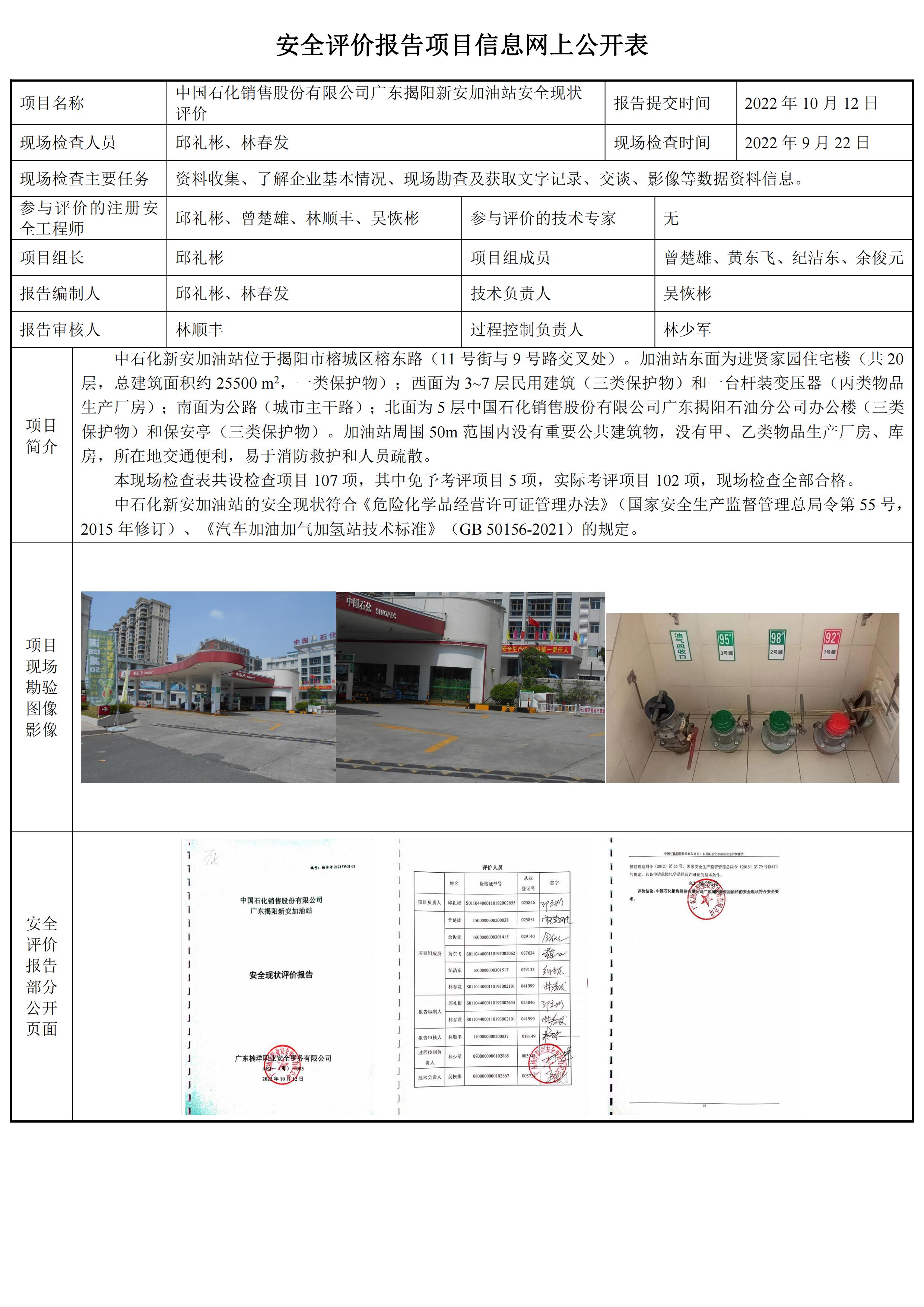 中国石化销售股份有限公司广东揭阳新安加油站安全现状评价报告