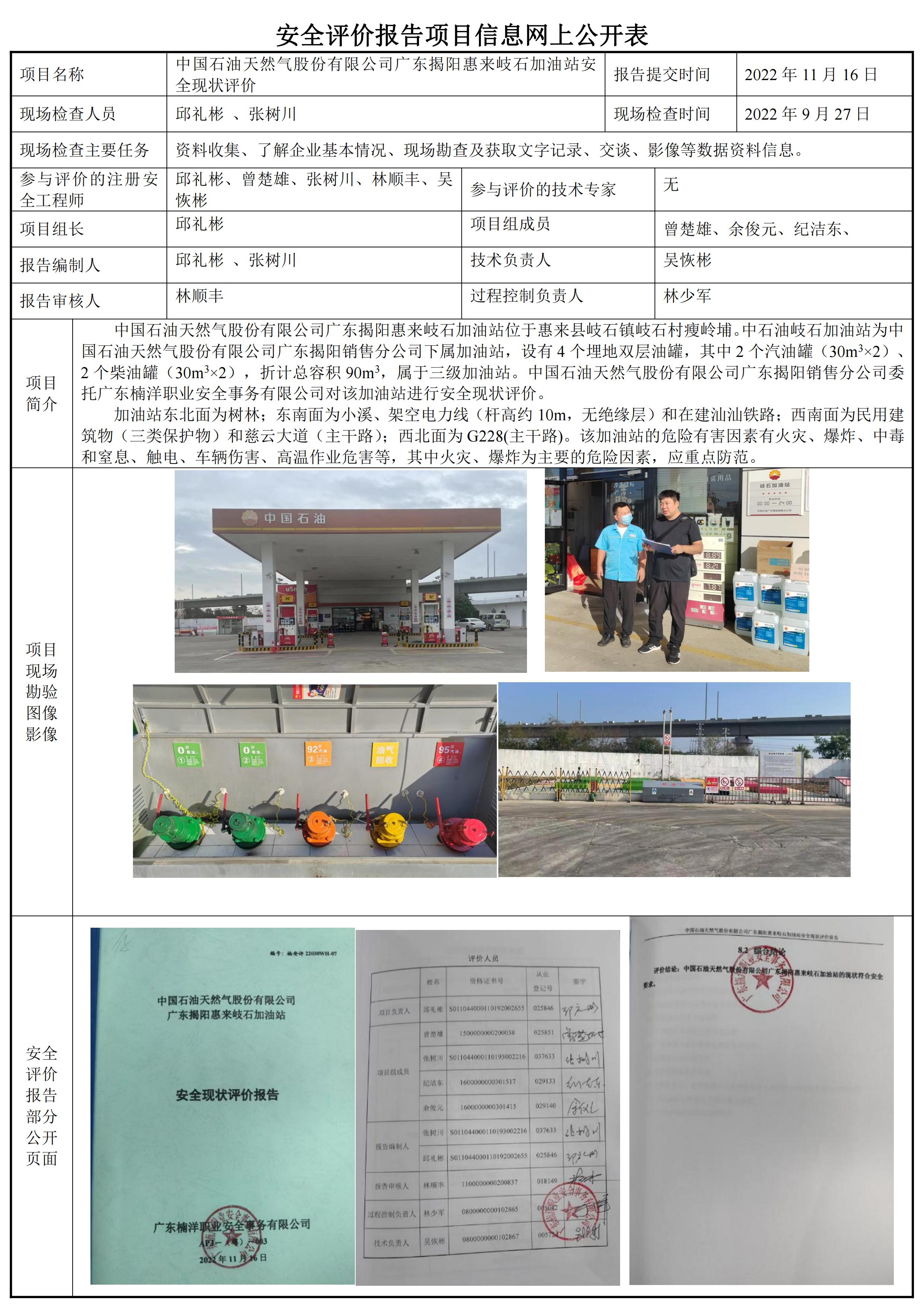 中国石油天然气股份有限公司广东揭阳惠来岐石加油站安全现状评价报告