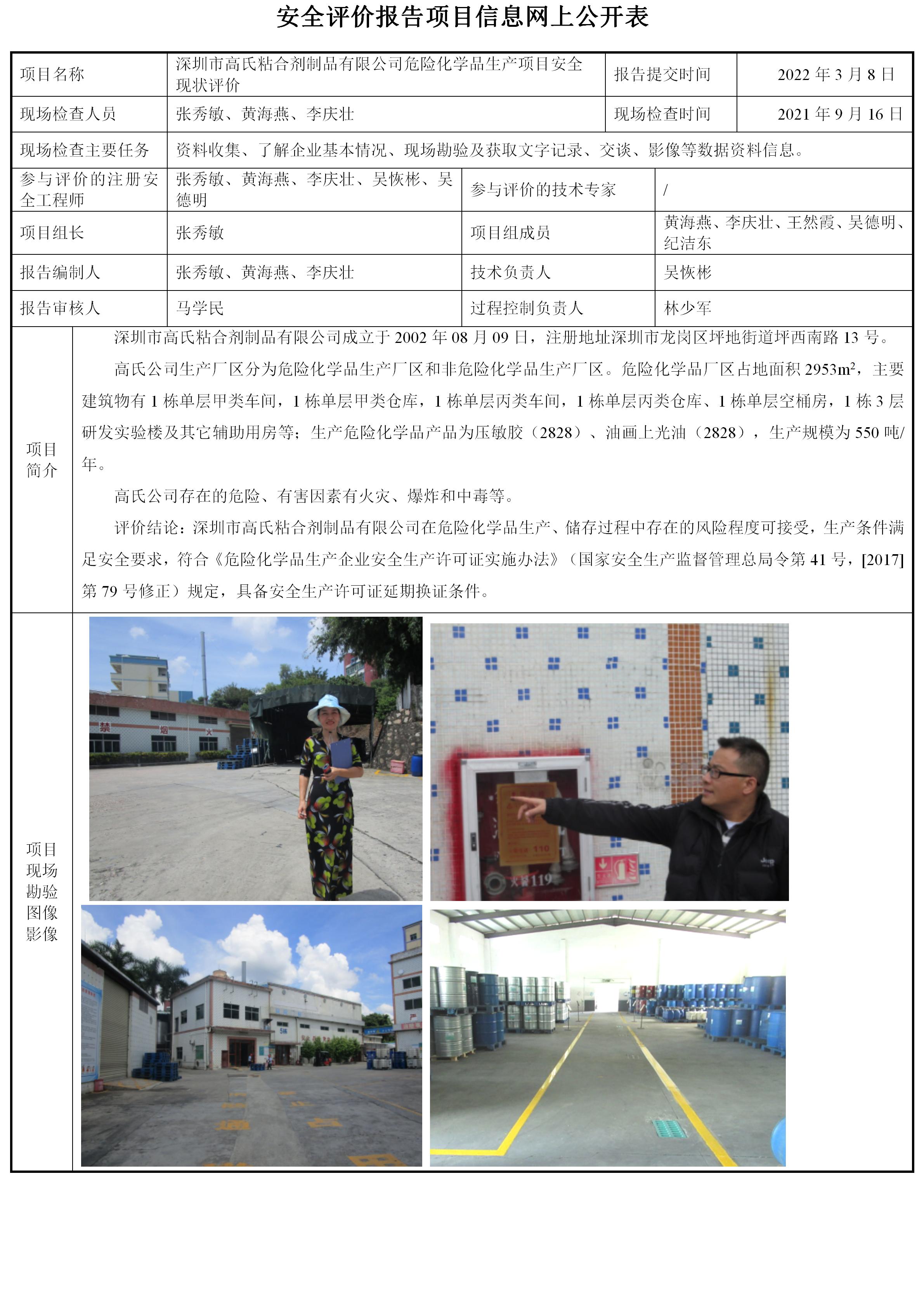 深圳市高氏粘合剂制品有限公司危险化学品生产项目安全现状评价