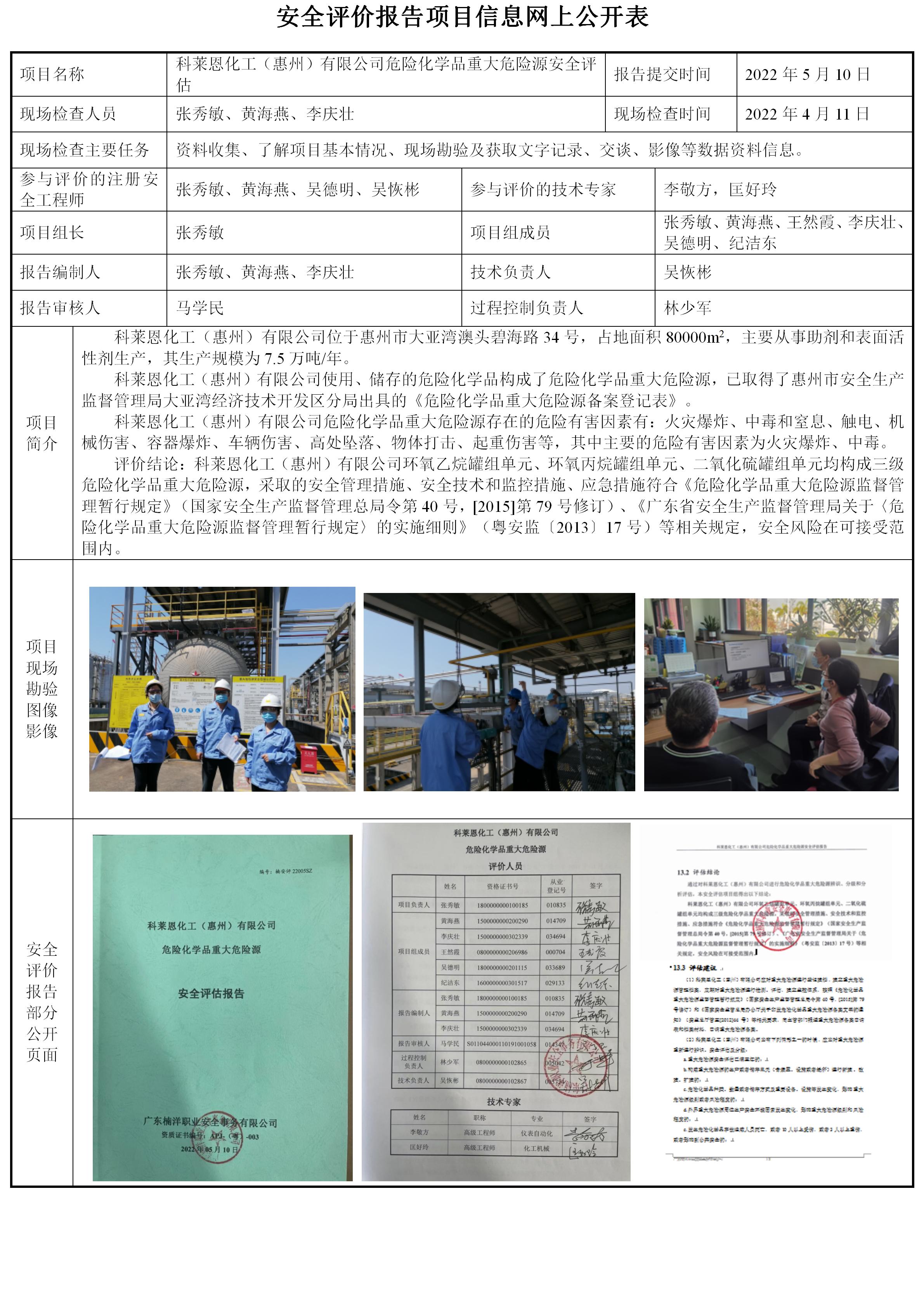 科莱恩化工(惠州)有限公司危险化学品重大危险源安全评估