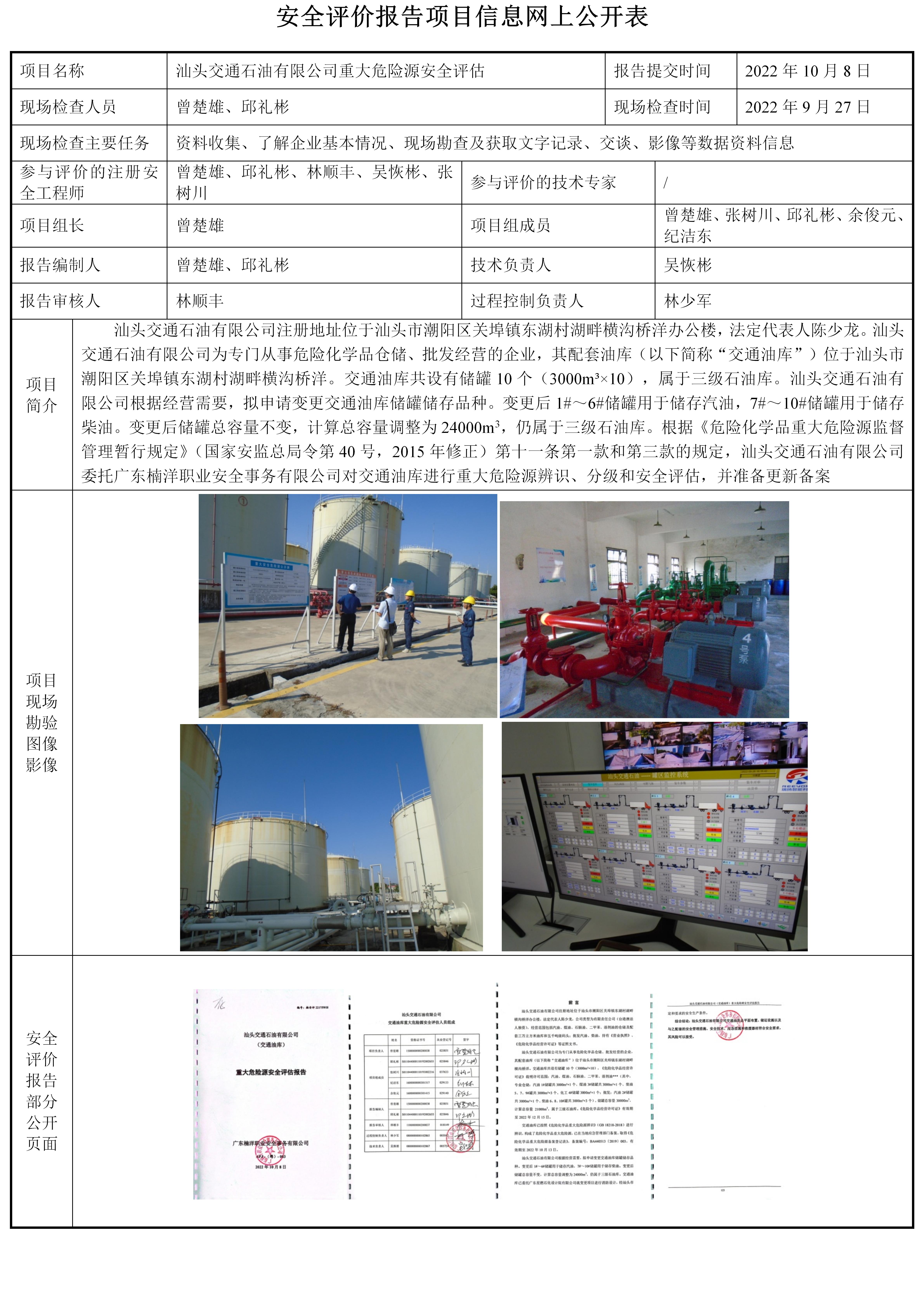 汕头交通石油有限公司(交通油库)重大危险源安全评估