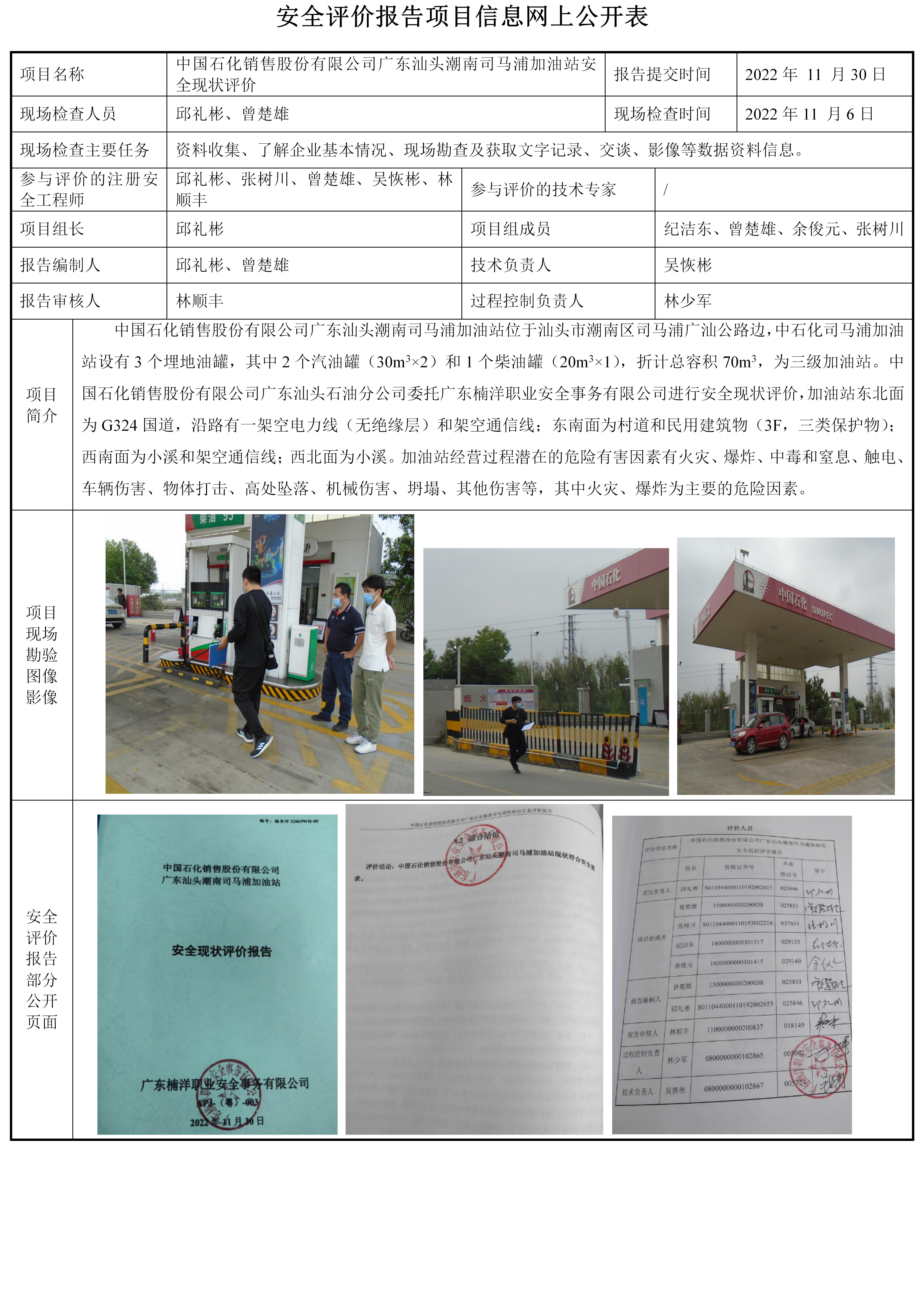 中国石化销售股份有限公司广东汕头潮南司马浦加油站安全现状评价