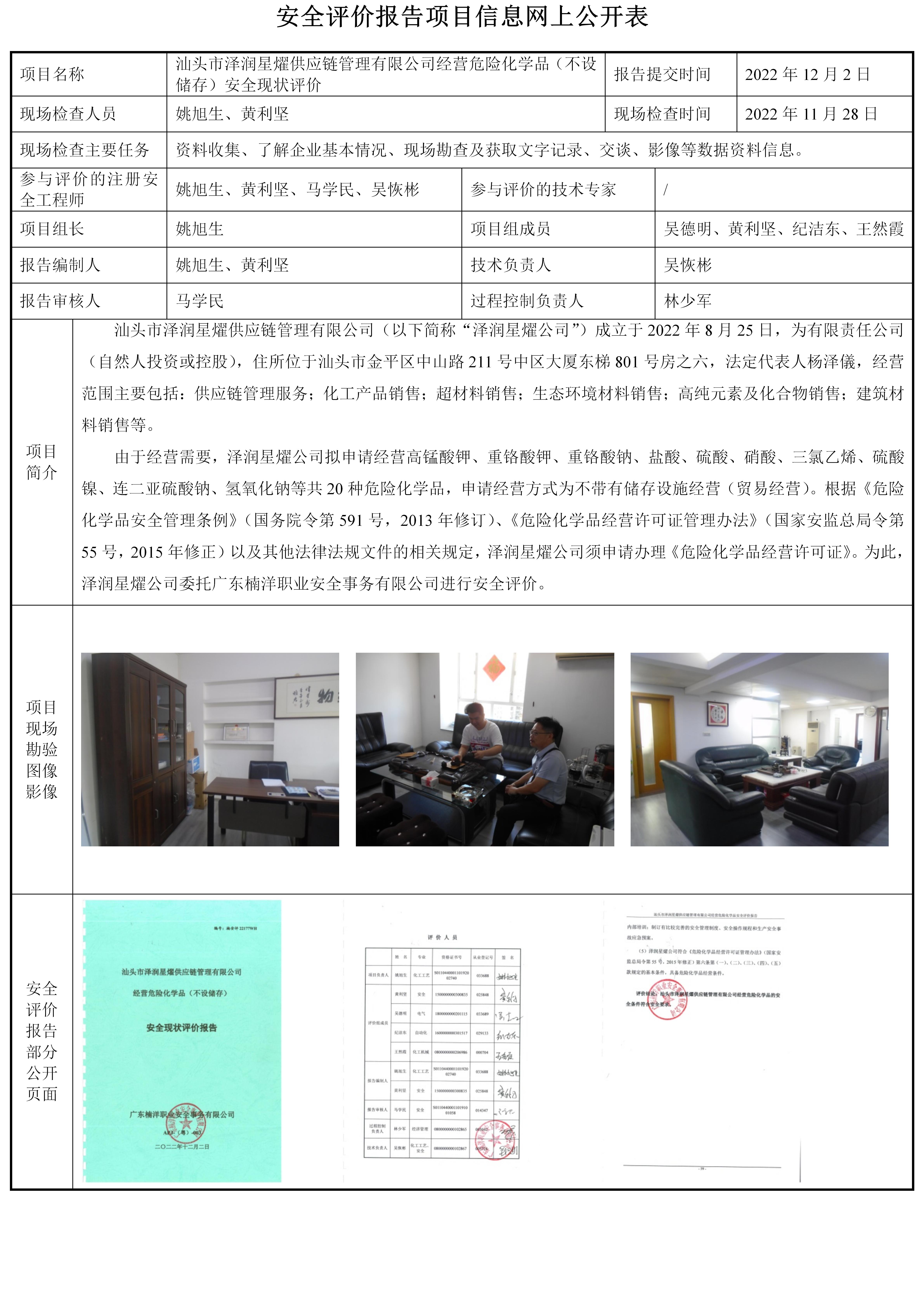 汕头市泽润星燿供应链管理有限公司经营危险化学品(不设储存)安全现状评价