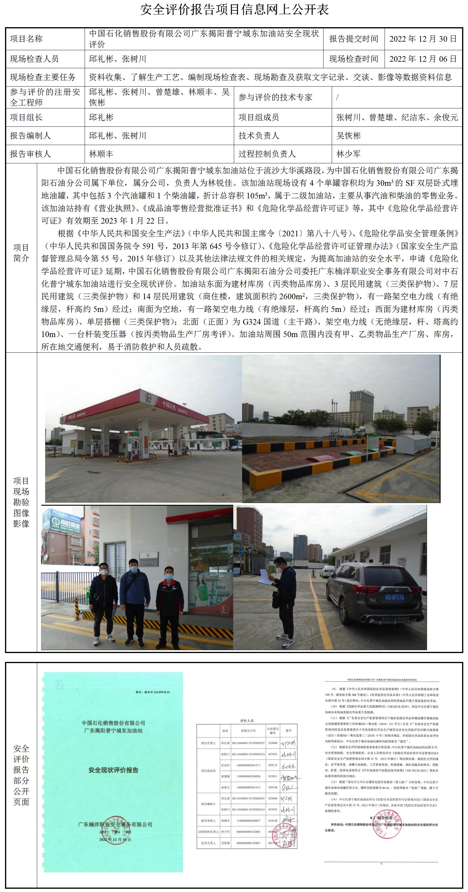 中国石化销售股份有限公司广东揭阳普宁城东加油站安全现状评价