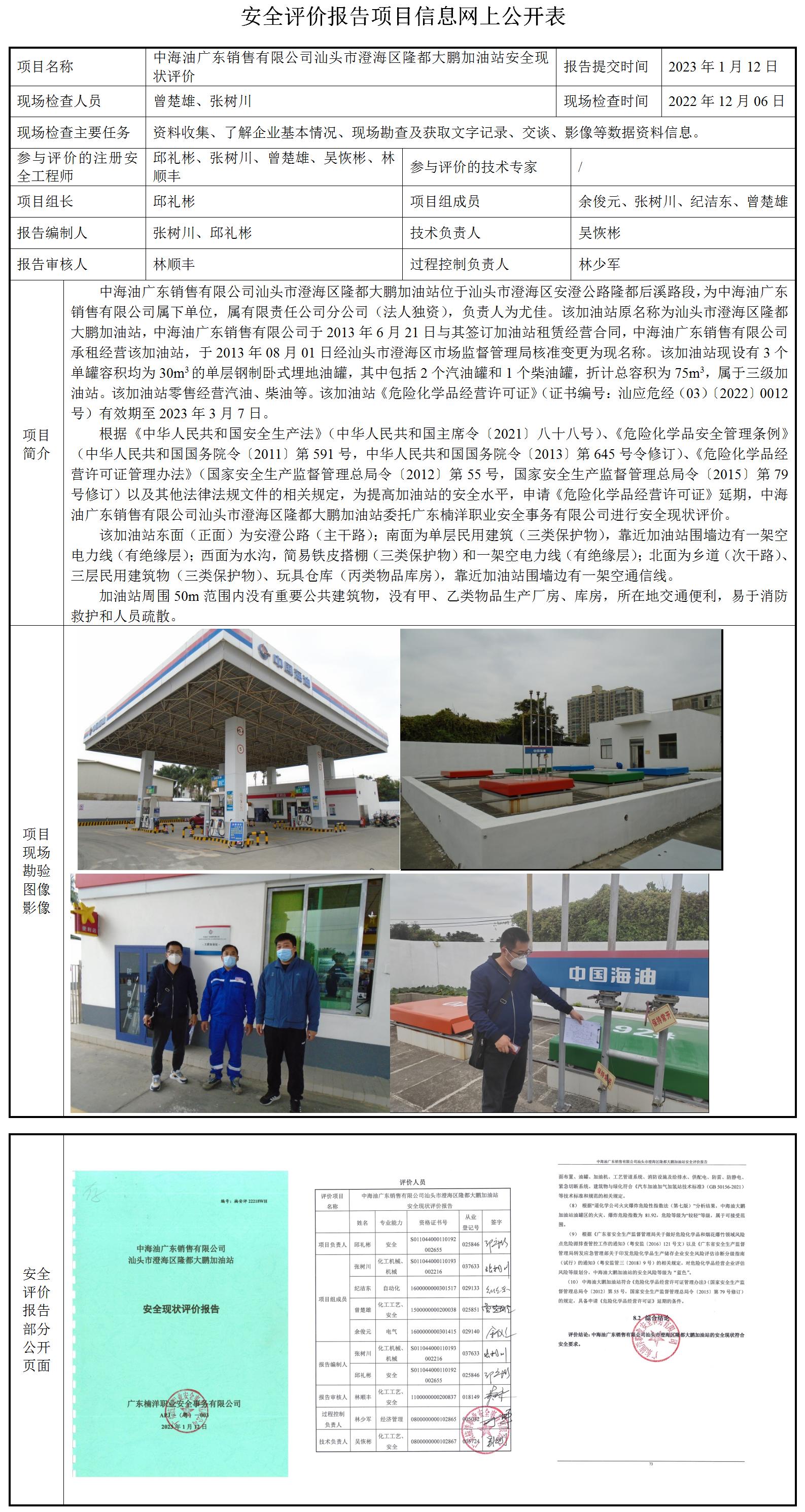 中海油广东销售有限公司汕头市澄海区隆都大鹏加油站安全现状评价