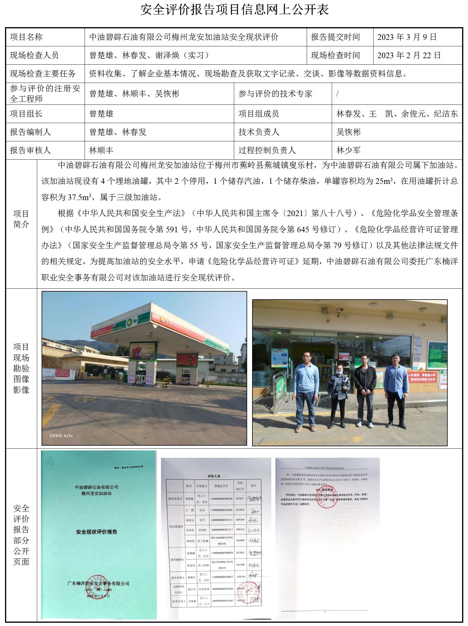 中油碧辟石油有限公司梅州龙安加油站安全现状评价