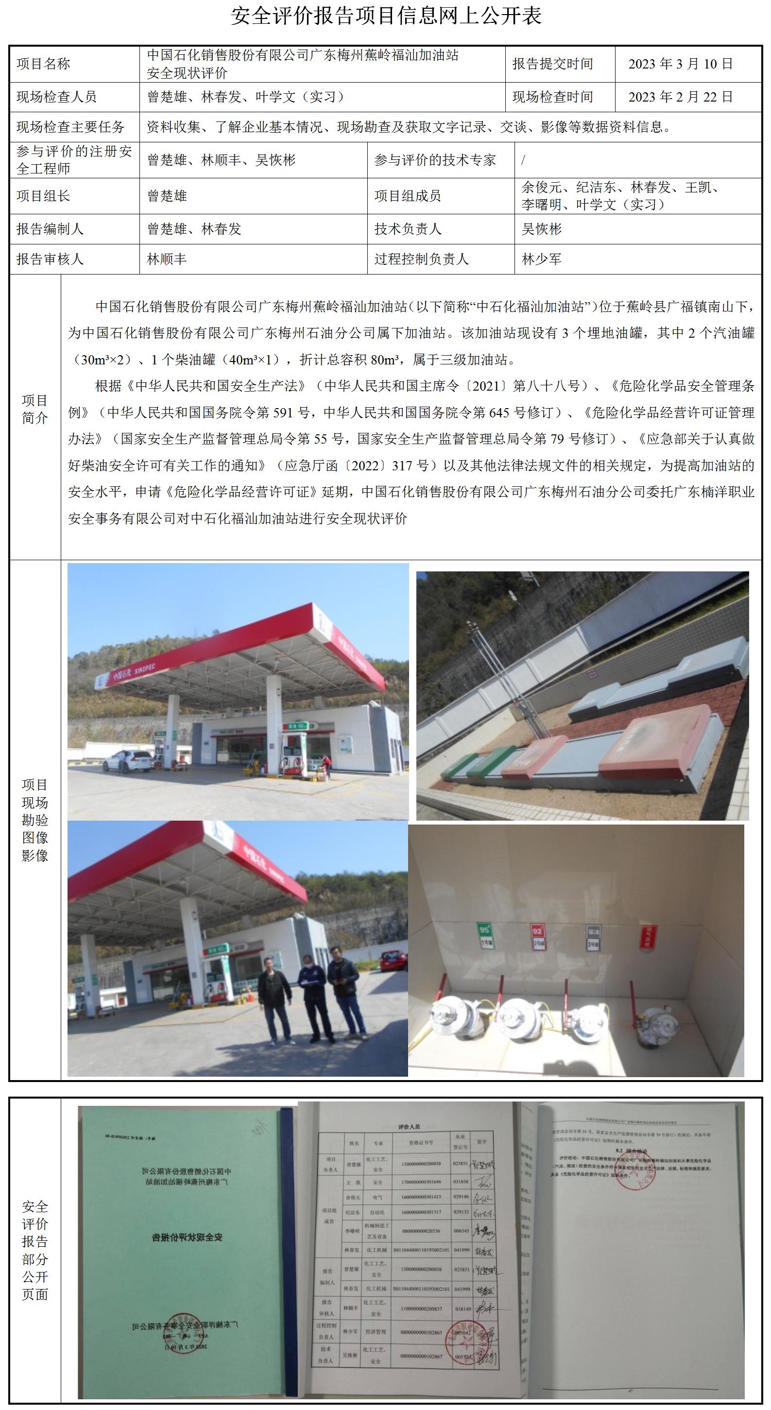 中国石化销售股份有限公司广东梅州蕉岭福汕加油站安全现状评价