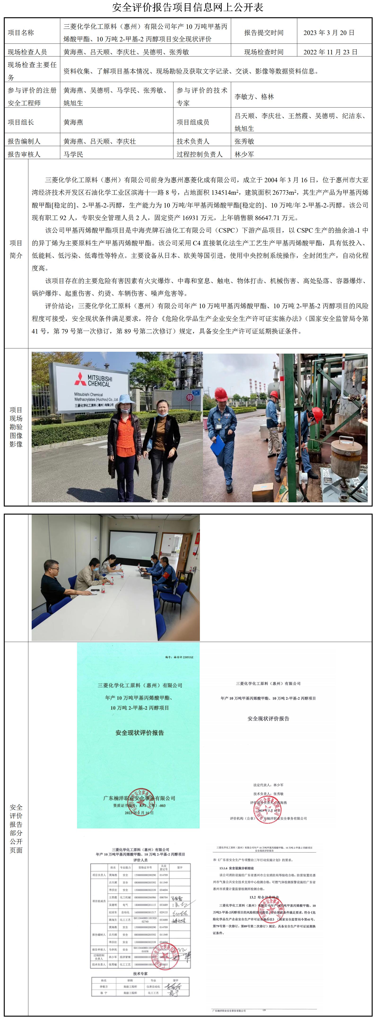 三菱化学化工原料(惠州)有限公司年产10万吨甲基丙烯酸甲酯、10万吨2-甲基-2丙醇项目安全现状评价