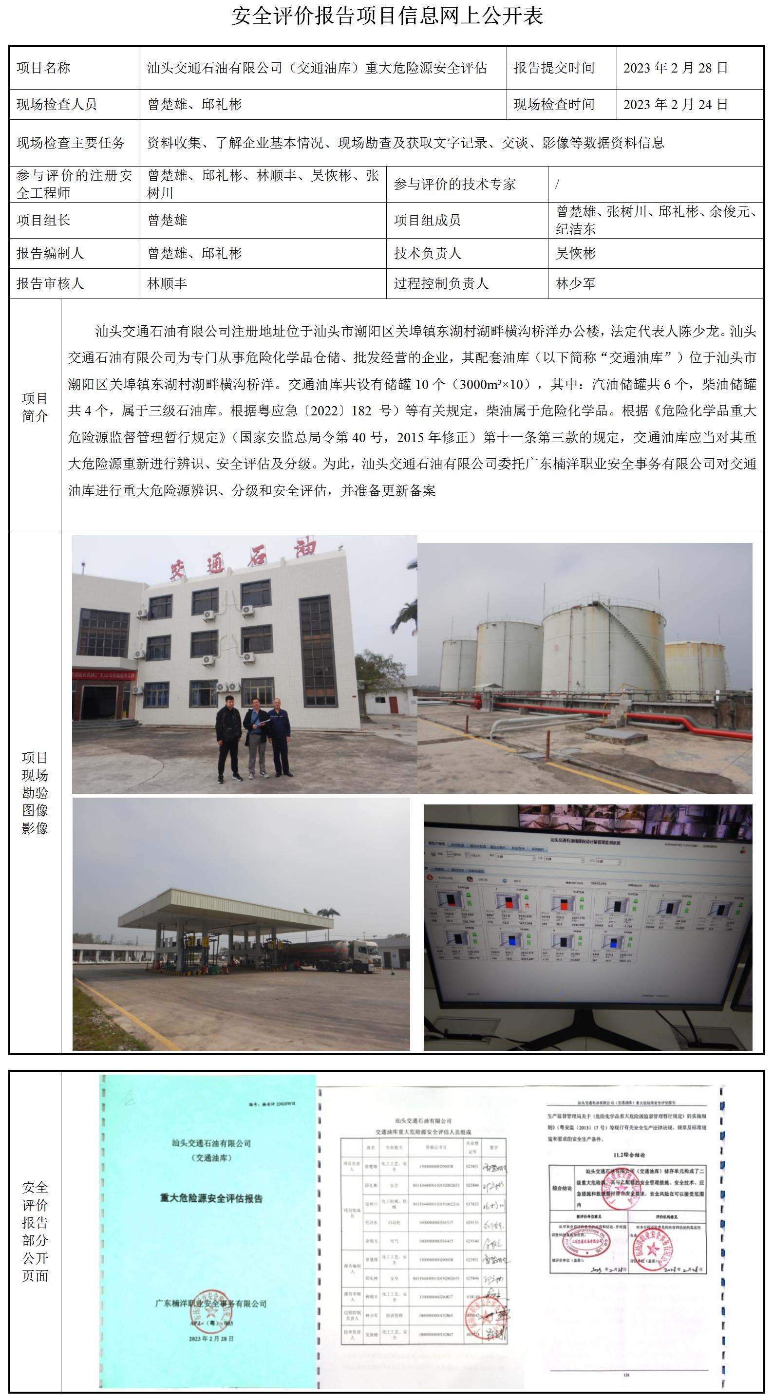 汕头交通石油有限公司(交通油库)重大危险源安全评估