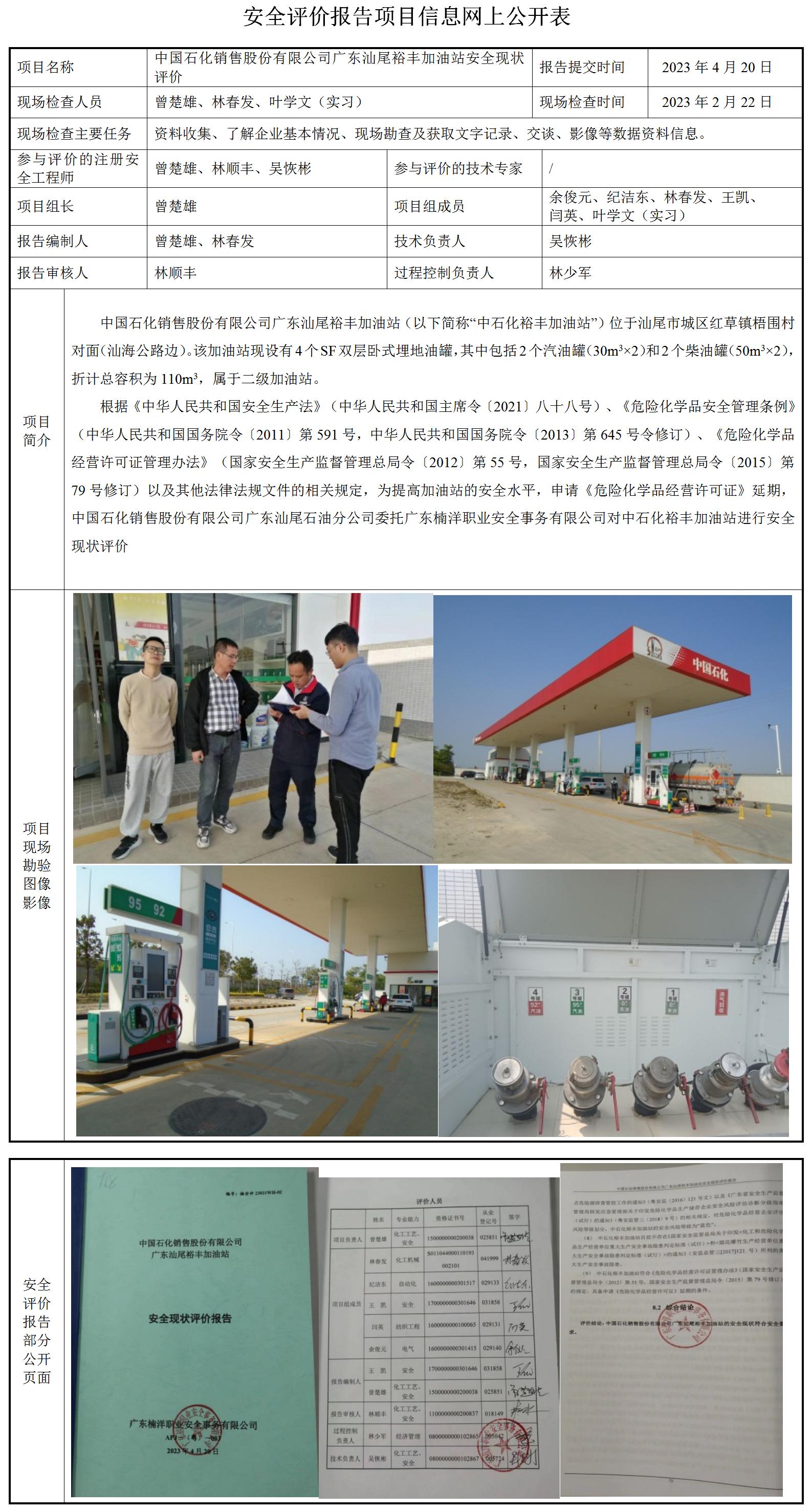 中国石化销售股份有限公司广东汕尾裕丰加油站安全现状评价