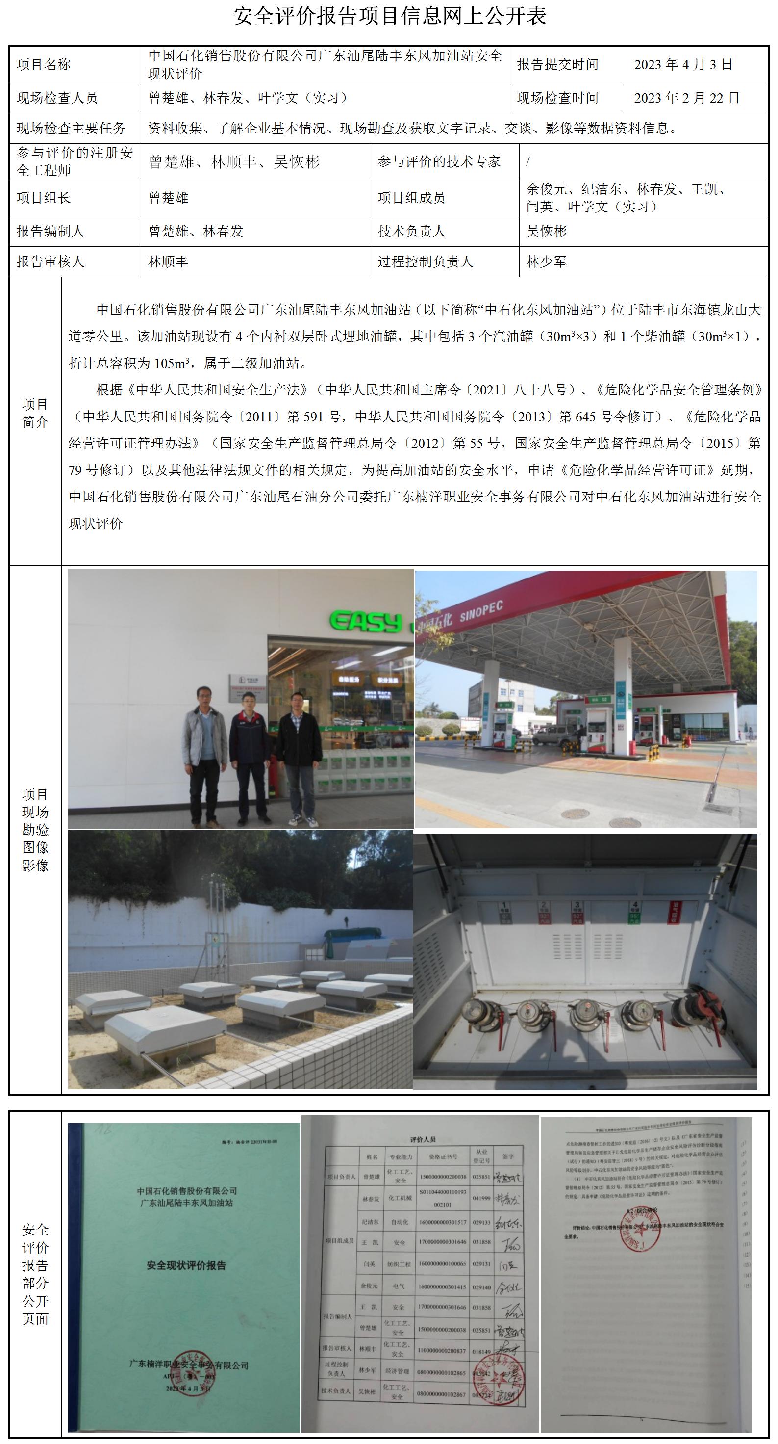 中国石化销售股份有限公司广东汕尾陆丰东风加油站安全现状评价