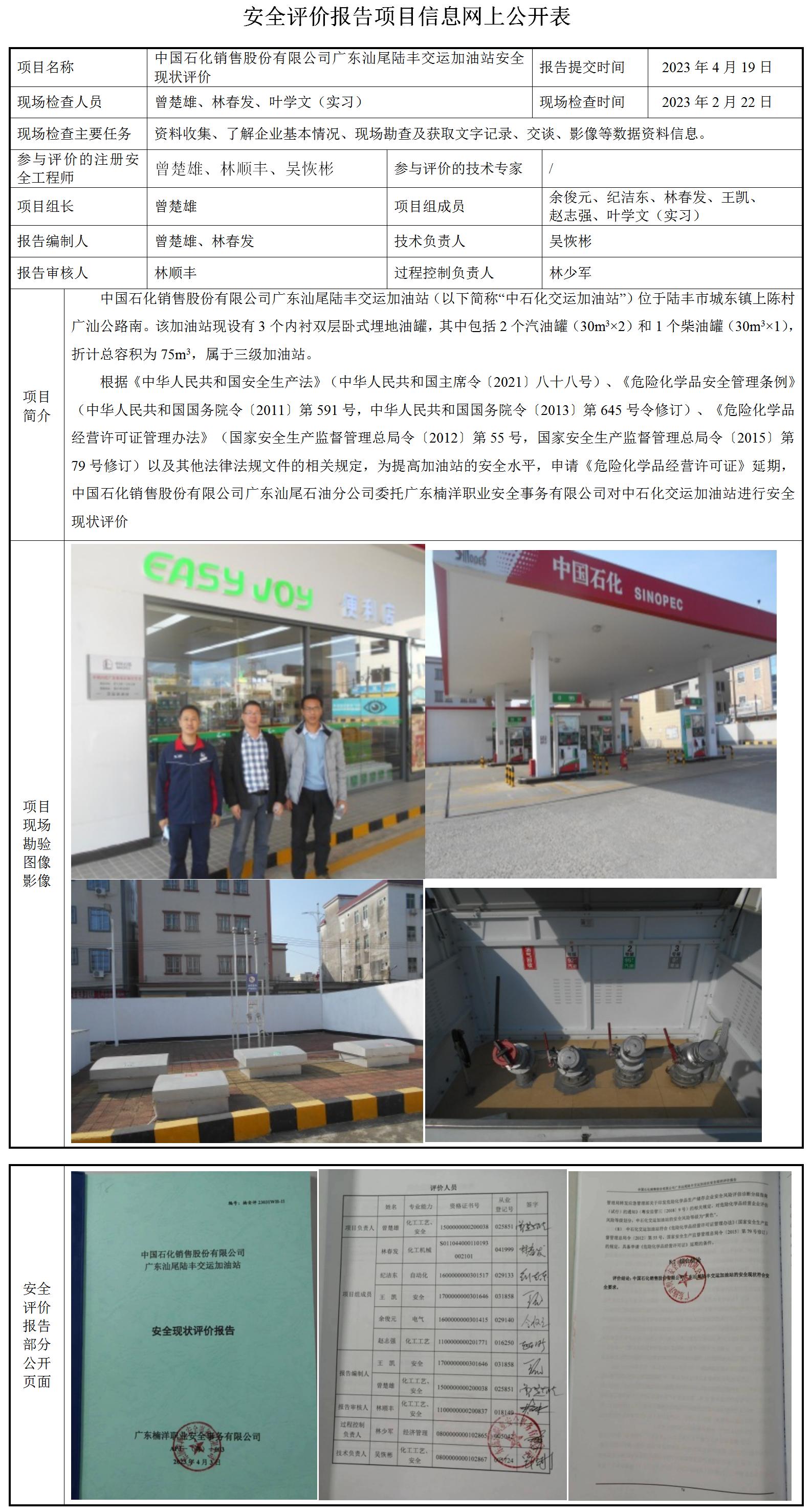 中国石化销售股份有限公司广东汕尾陆丰交运加油站安全现状评价