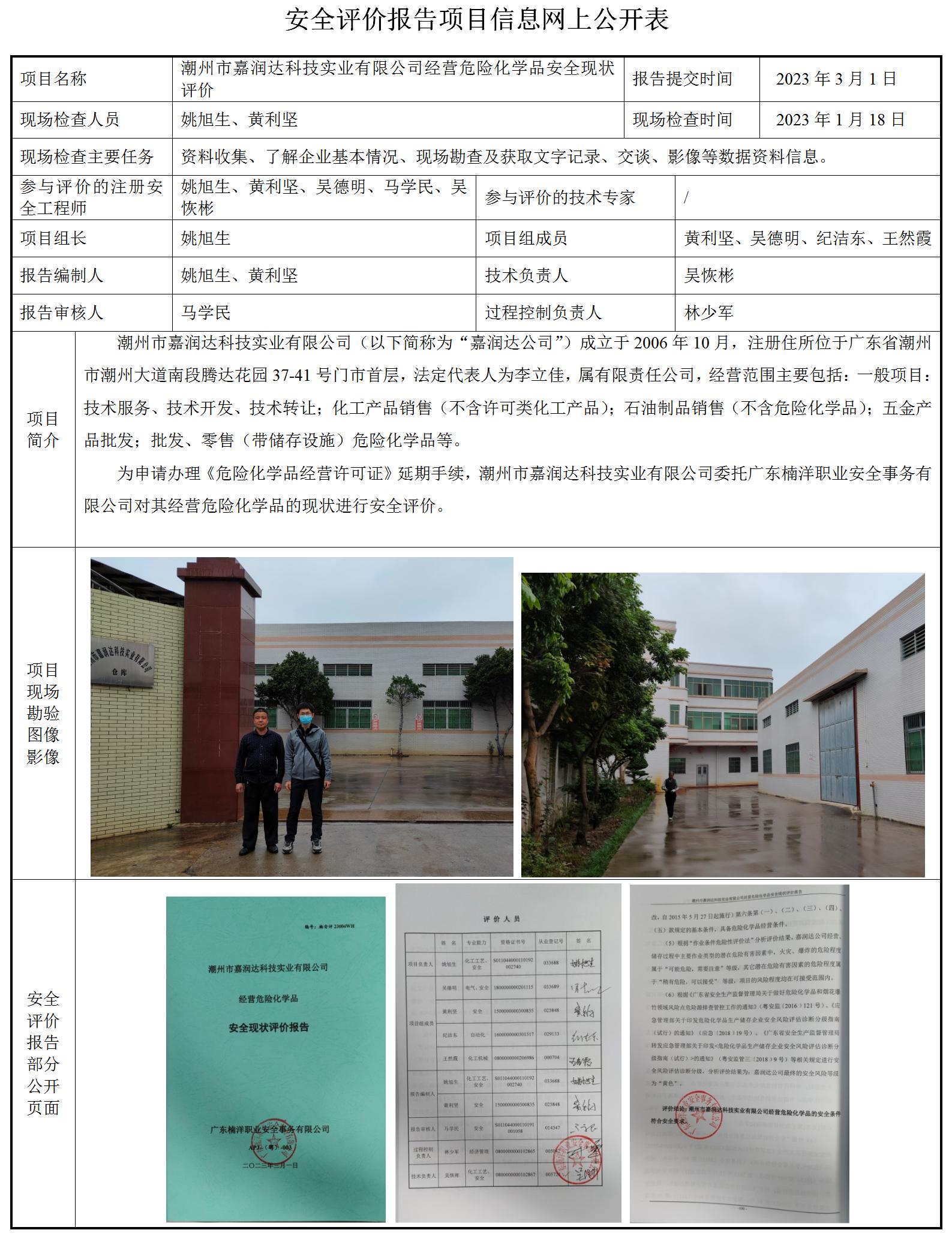 潮州市嘉润达科技实业有限公司经营危险化学品安全现状评价
