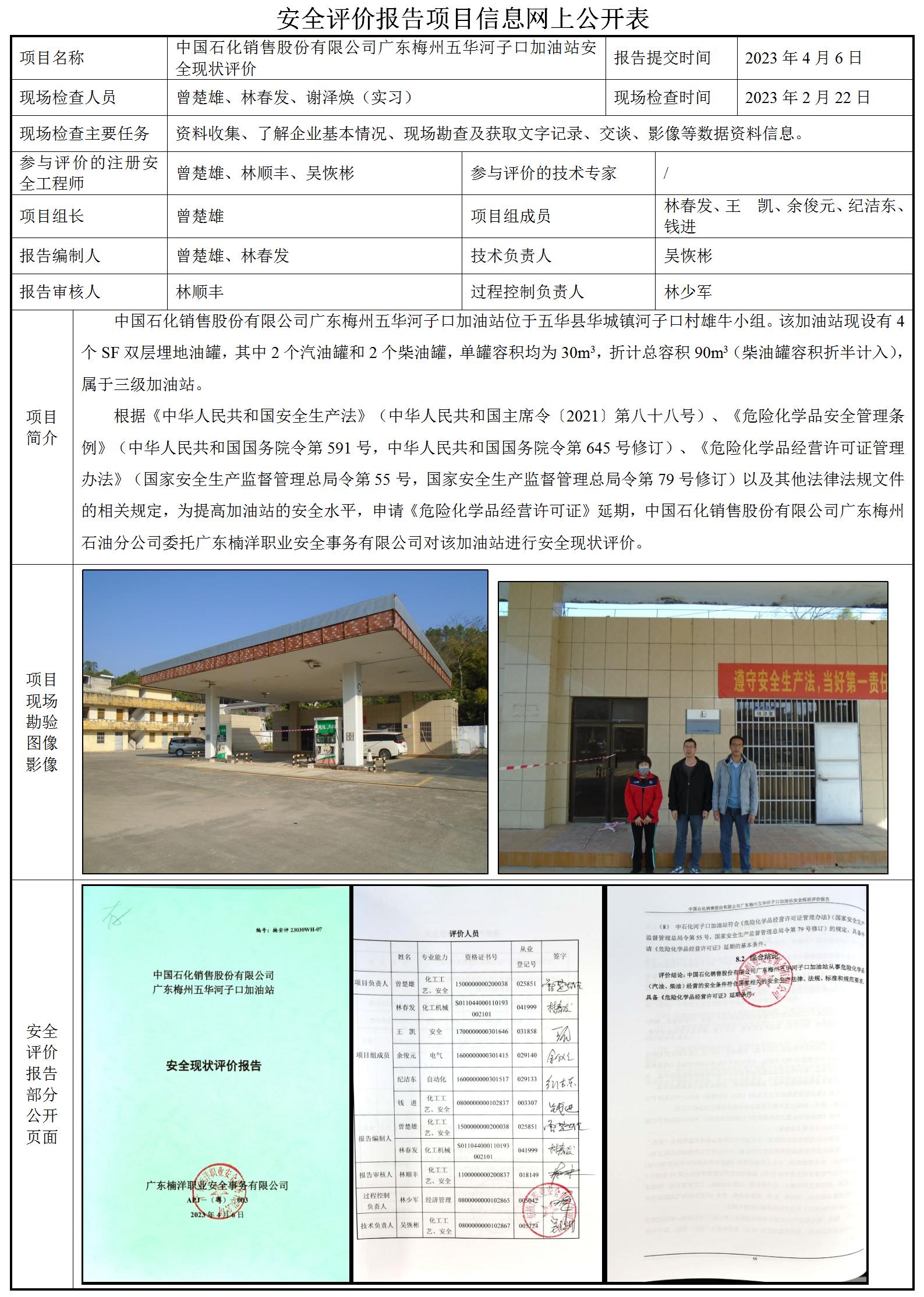 中国石化销售股份有限公司广东梅州五华河子口加油站安全现状评价