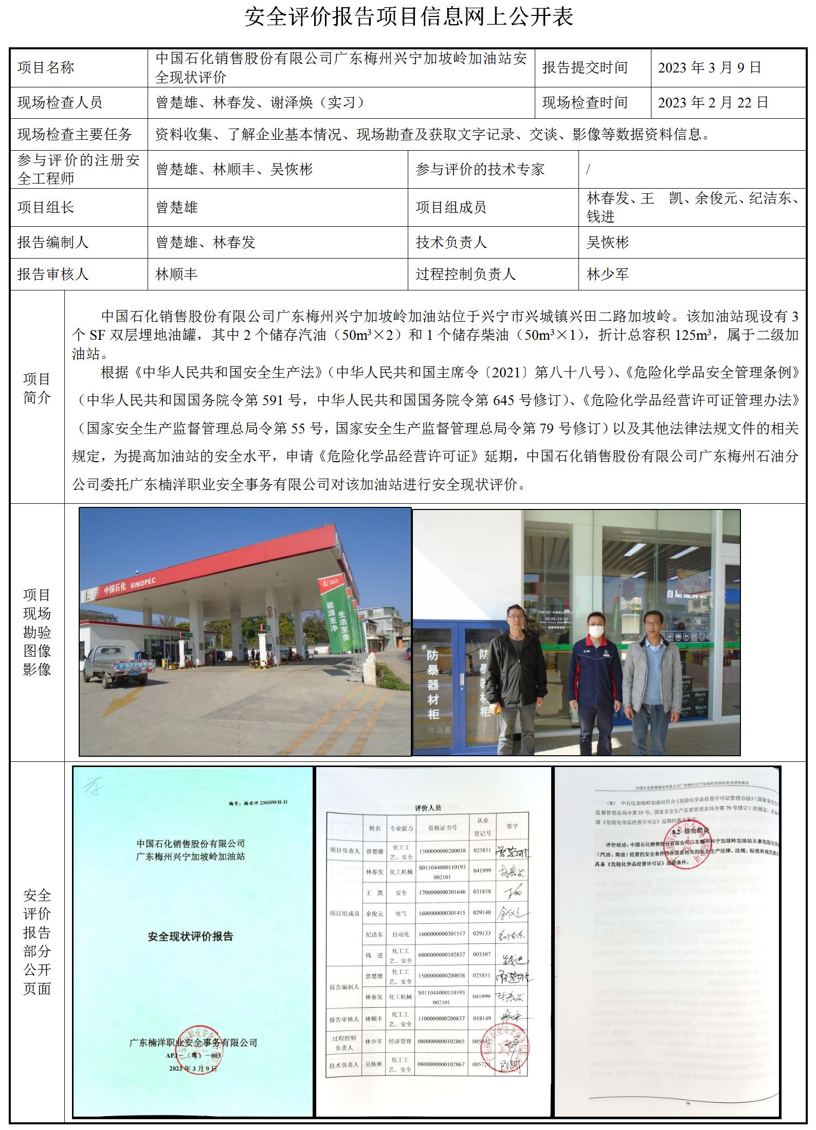 中国石化销售股份有限公司广东梅州兴宁加坡岭加油站安全现状评价