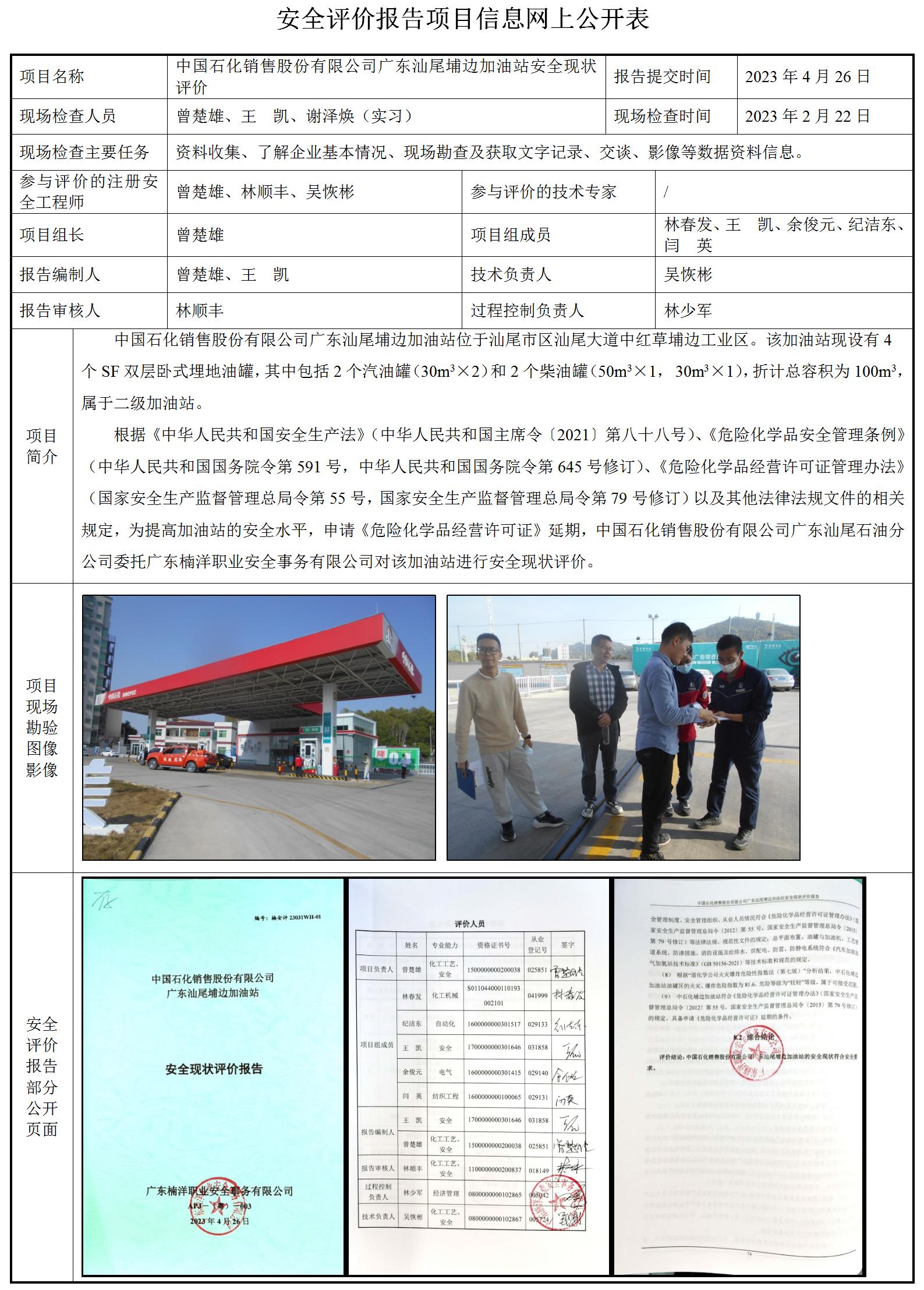 中国石化销售股份有限公司广东汕尾埔边加油站安全现状评价