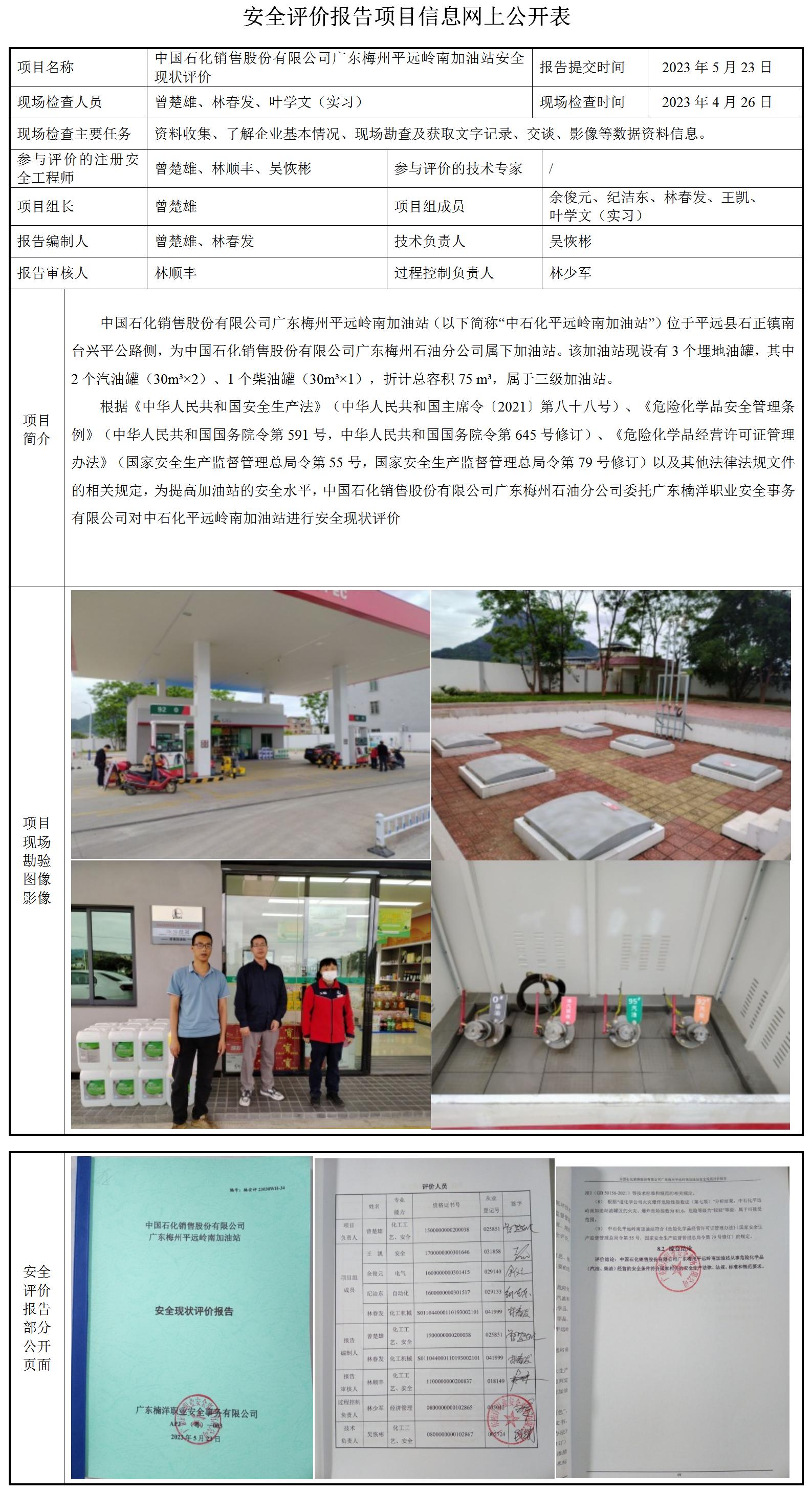 中国石化销售股份有限公司广东梅州平远岭南加油站安全现状评价