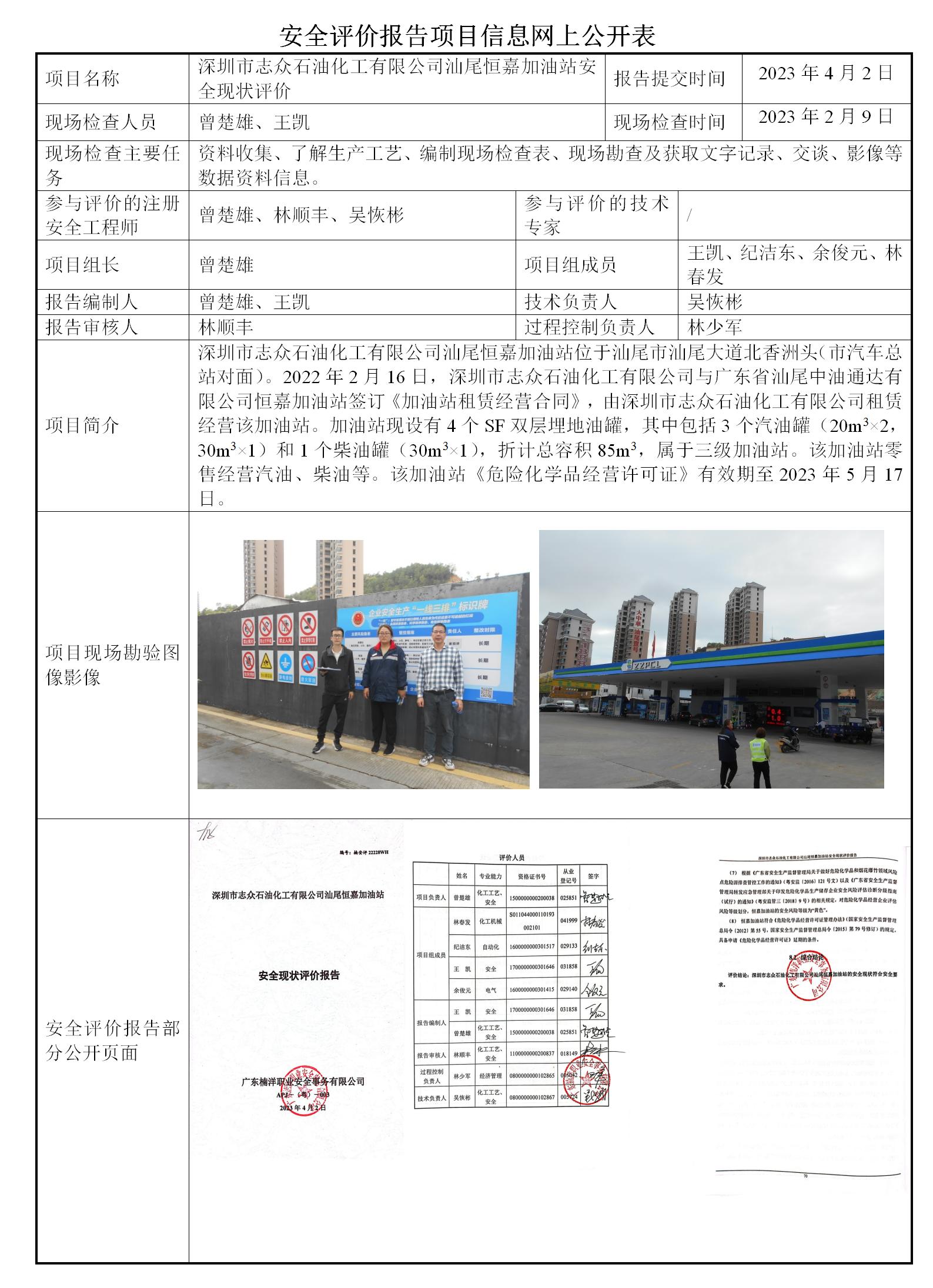 深圳市志众石油化工有限公司汕尾恒嘉加油站安全现状评价