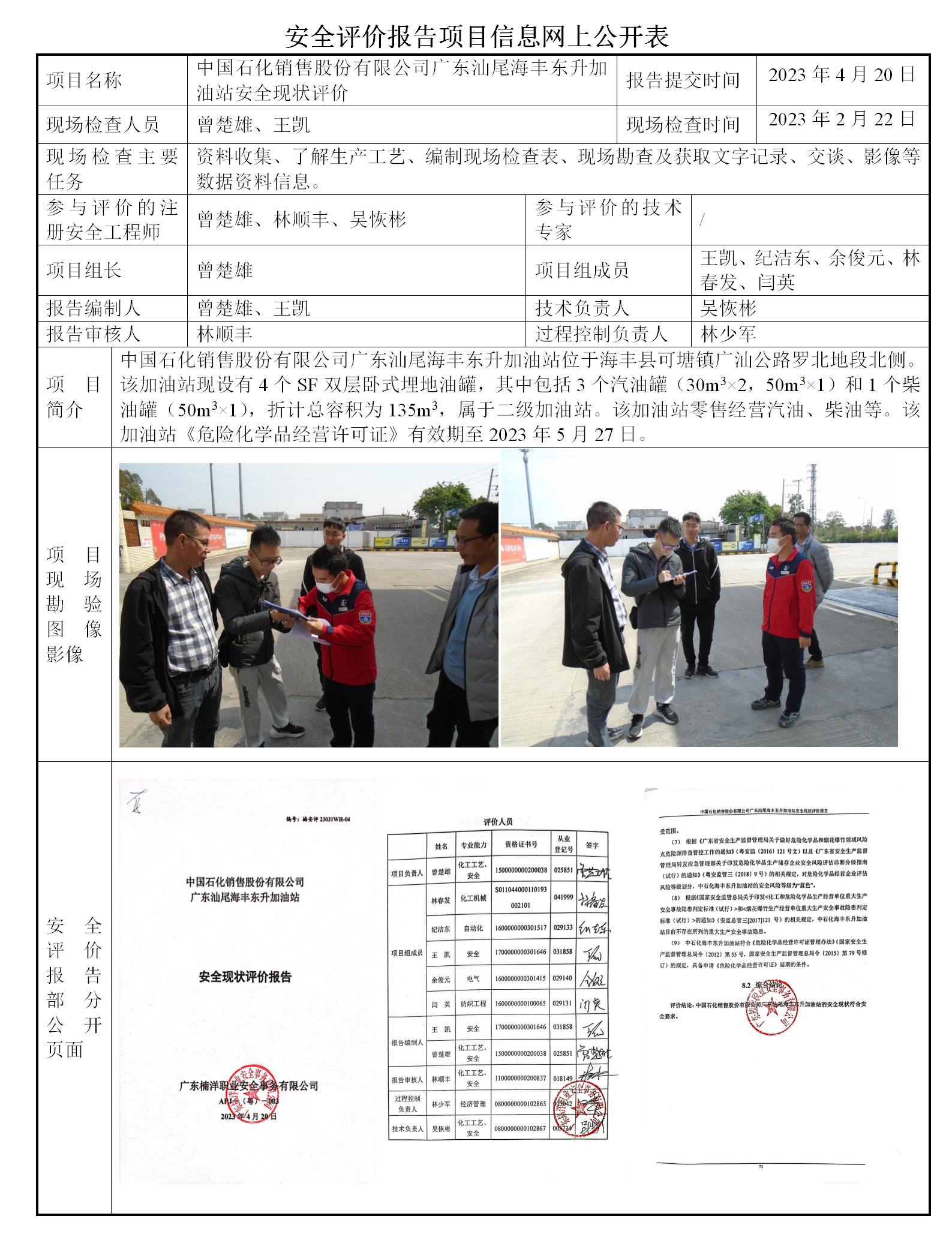 中国石化销售股份有限公司广东汕尾海丰东升加油站安全现状评价