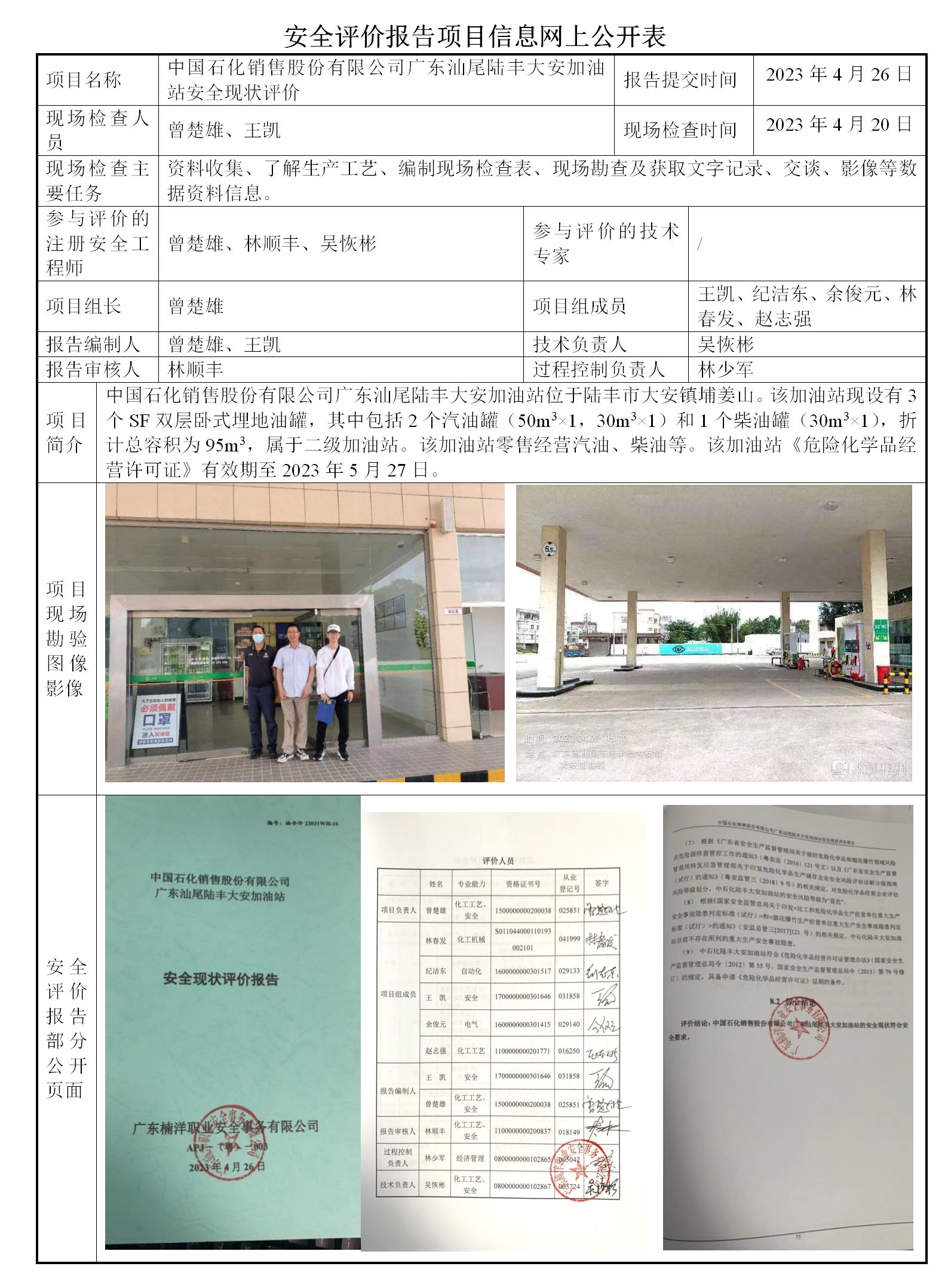 中国石化销售股份有限公司广东汕尾陆丰大安加油站安全现状评价