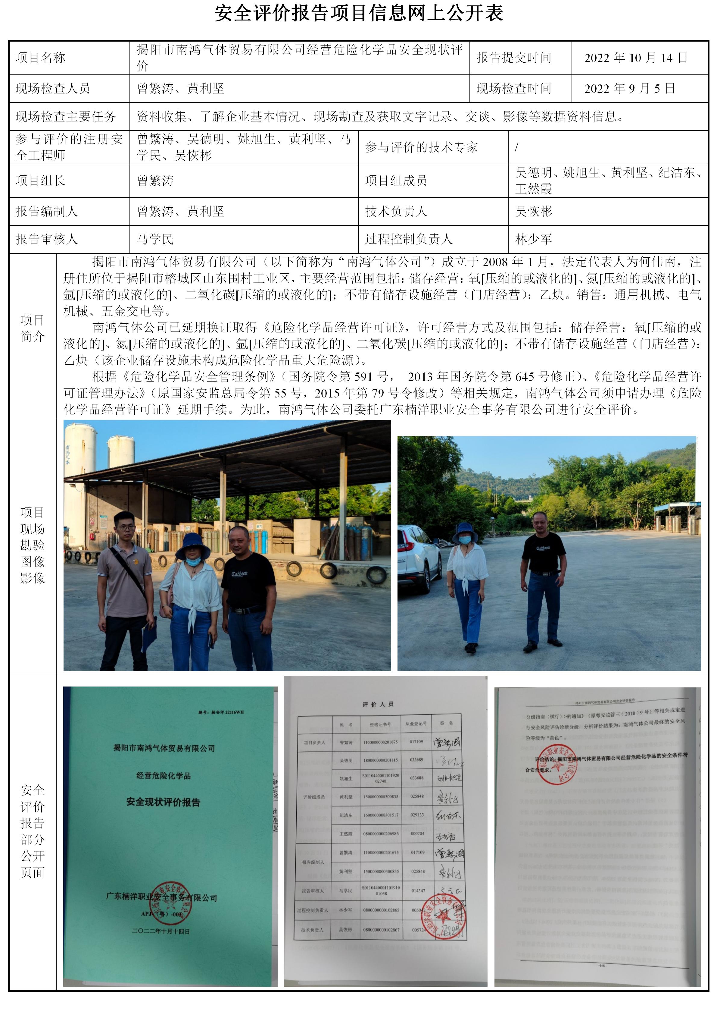 揭阳市南鸿气体贸易有限公司经营危险化学品安全现状评价