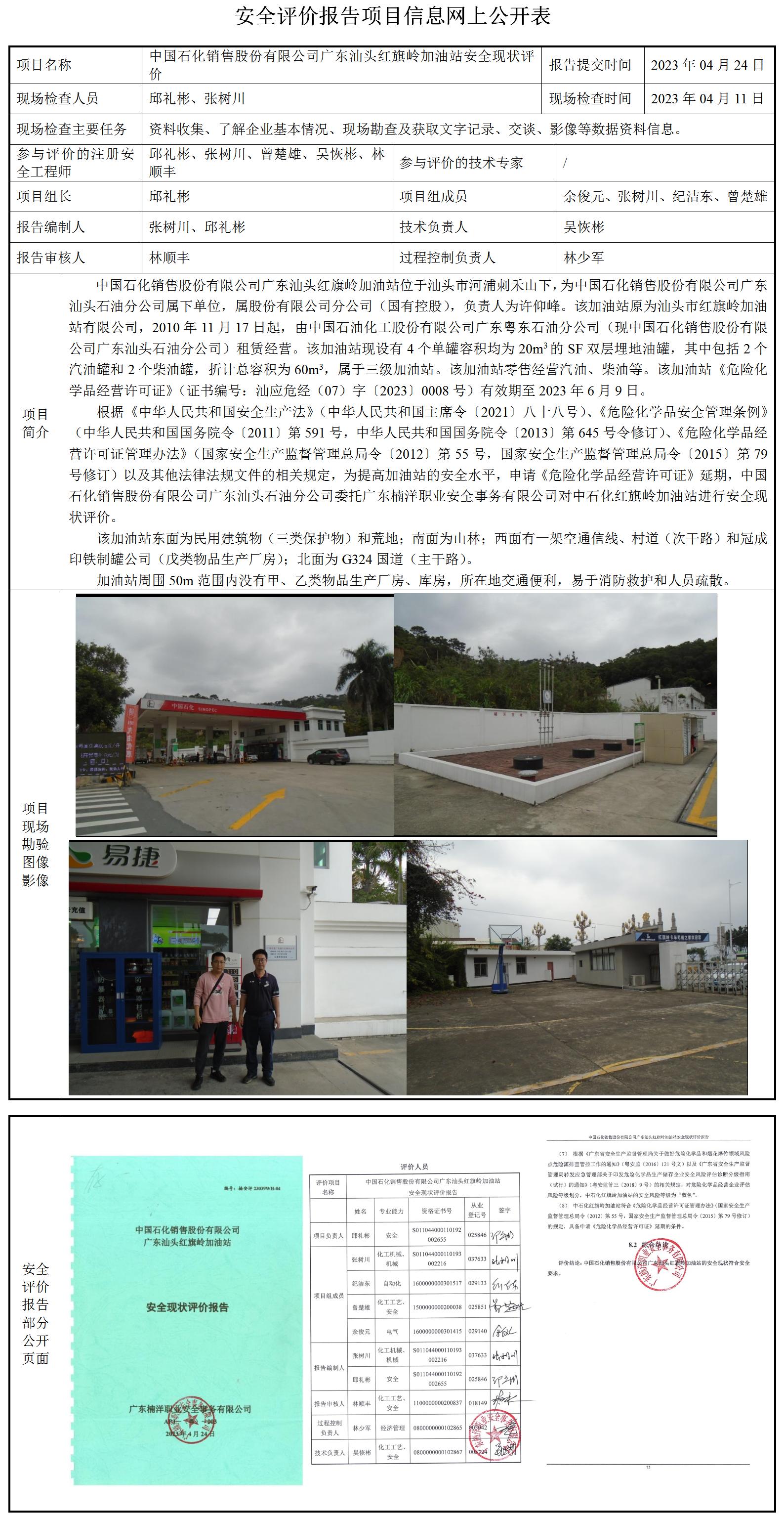 中国石化销售股份有限公司广东汕头红旗岭加油站安全现状评价