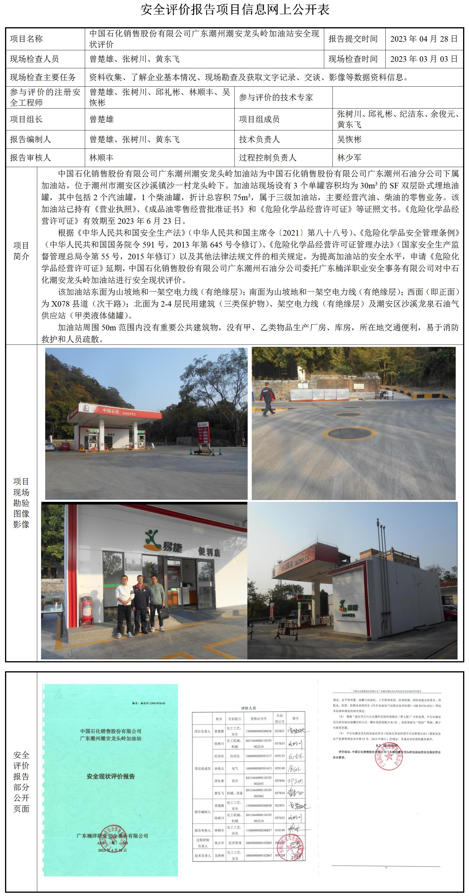 中国石化销售股份有限公司广东潮州潮安龙头岭加油站安全现状评价