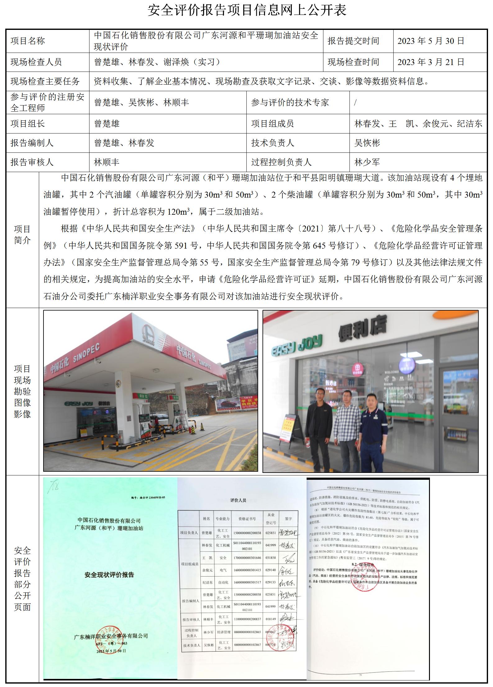 中国石化销售股份有限公司广东河源(和平)珊瑚加油站安全现状评价