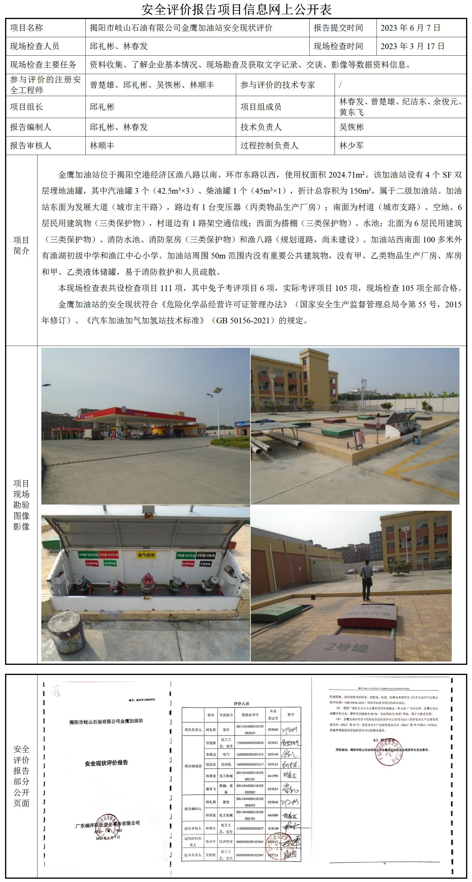 揭阳市岐山石油有限公司金鹰加油站安全现状评价