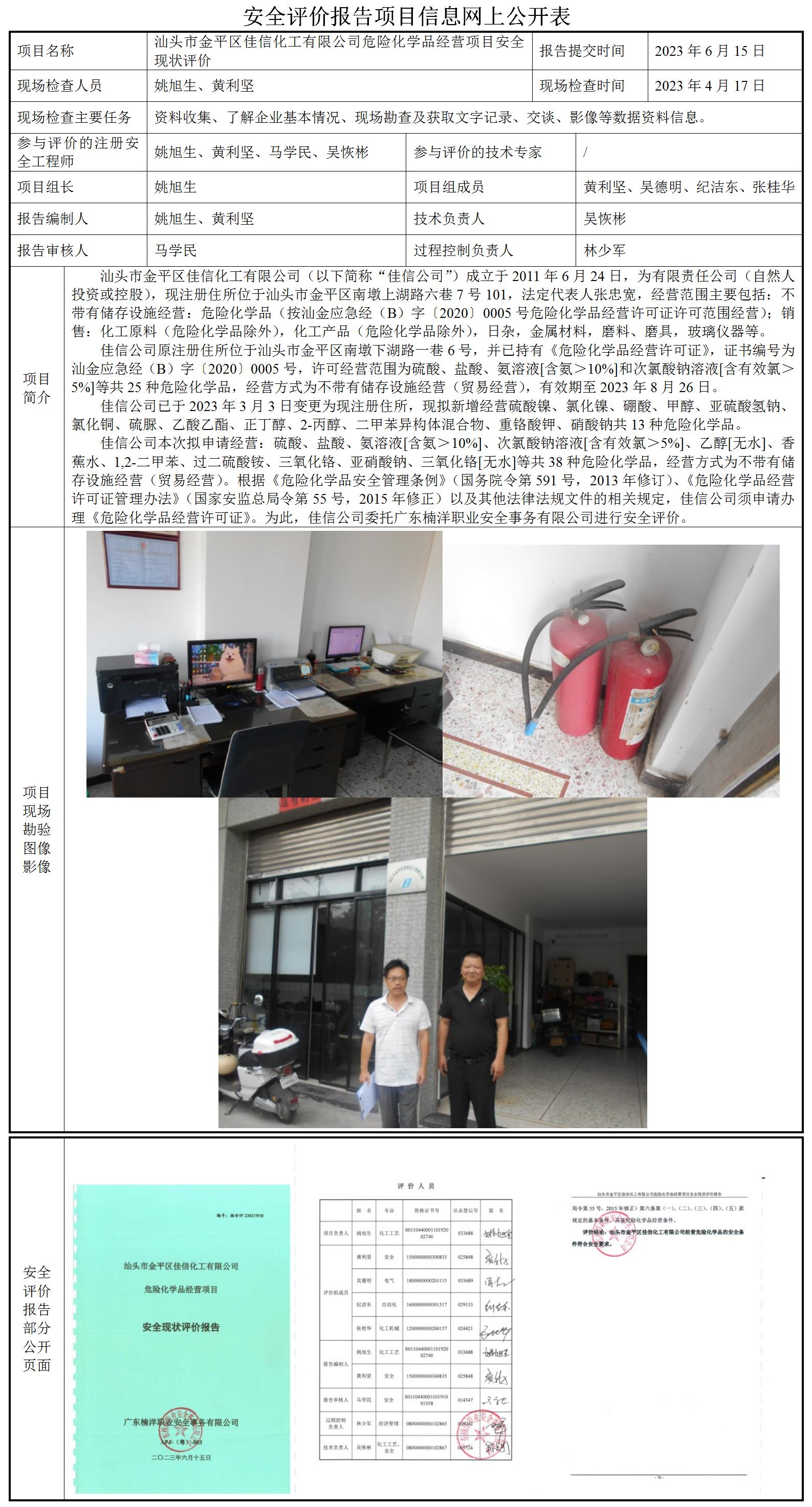 汕头市金平区佳信化工有限公司危险化学品经营项目安全现状评价