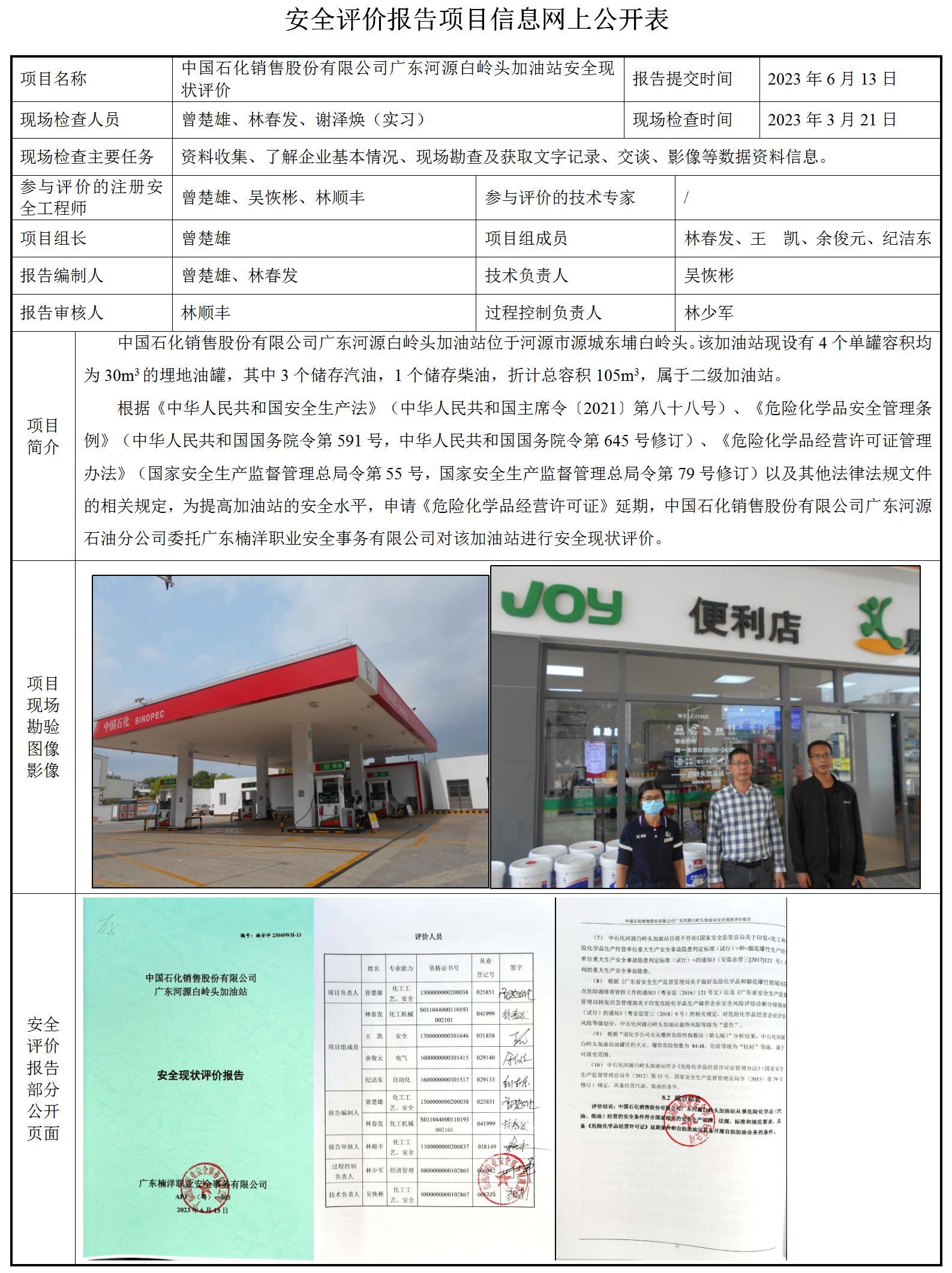 中国石化销售股份有限公司广东河源白岭头加油站安全现状评价