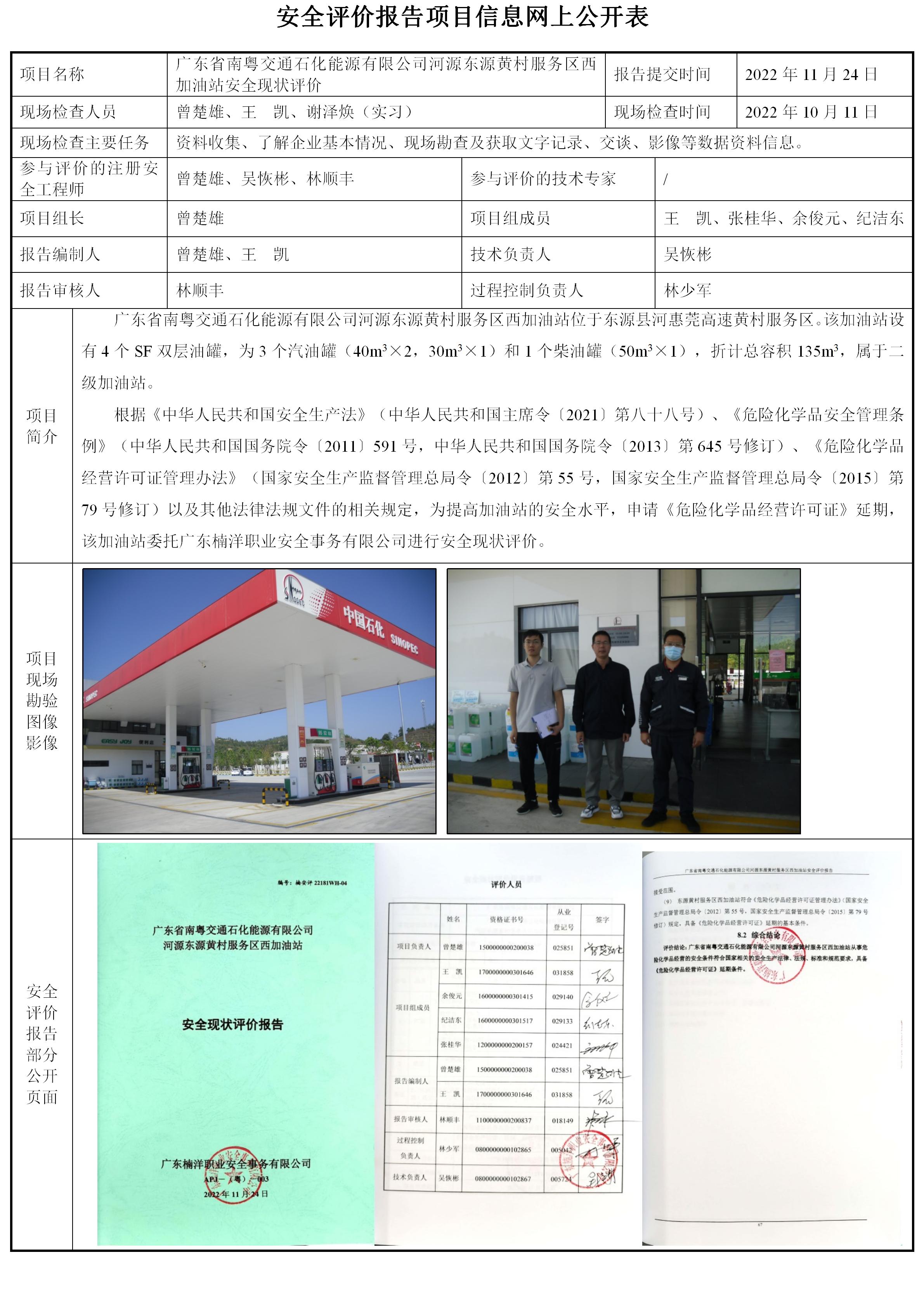 广东省南粤交通石化能源有限公司河源东源黄村服务区西加油站安全现状评价