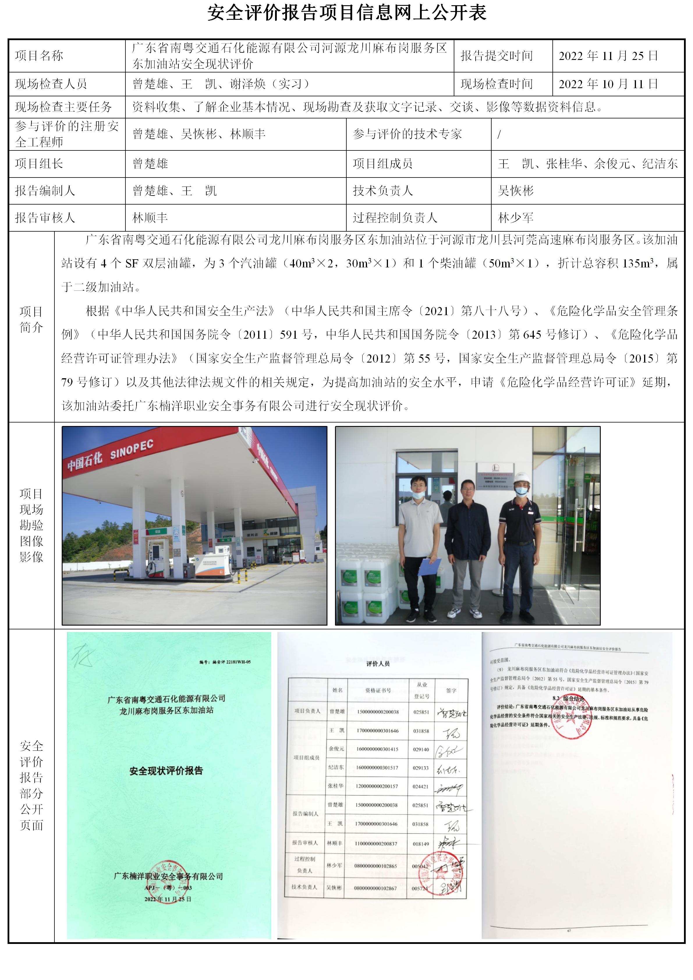 广东省南粤交通石化能源有限公司龙川麻布岗服务区东加油站安全现状评价