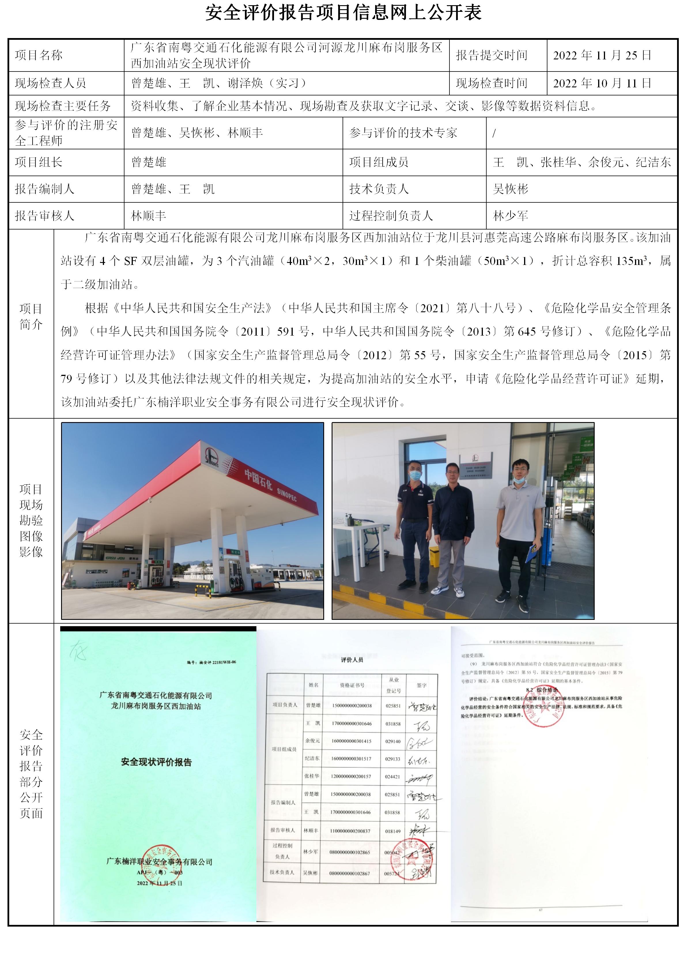 广东省南粤交通石化能源有限公司龙川麻布岗服务区西加油站安全现状评价