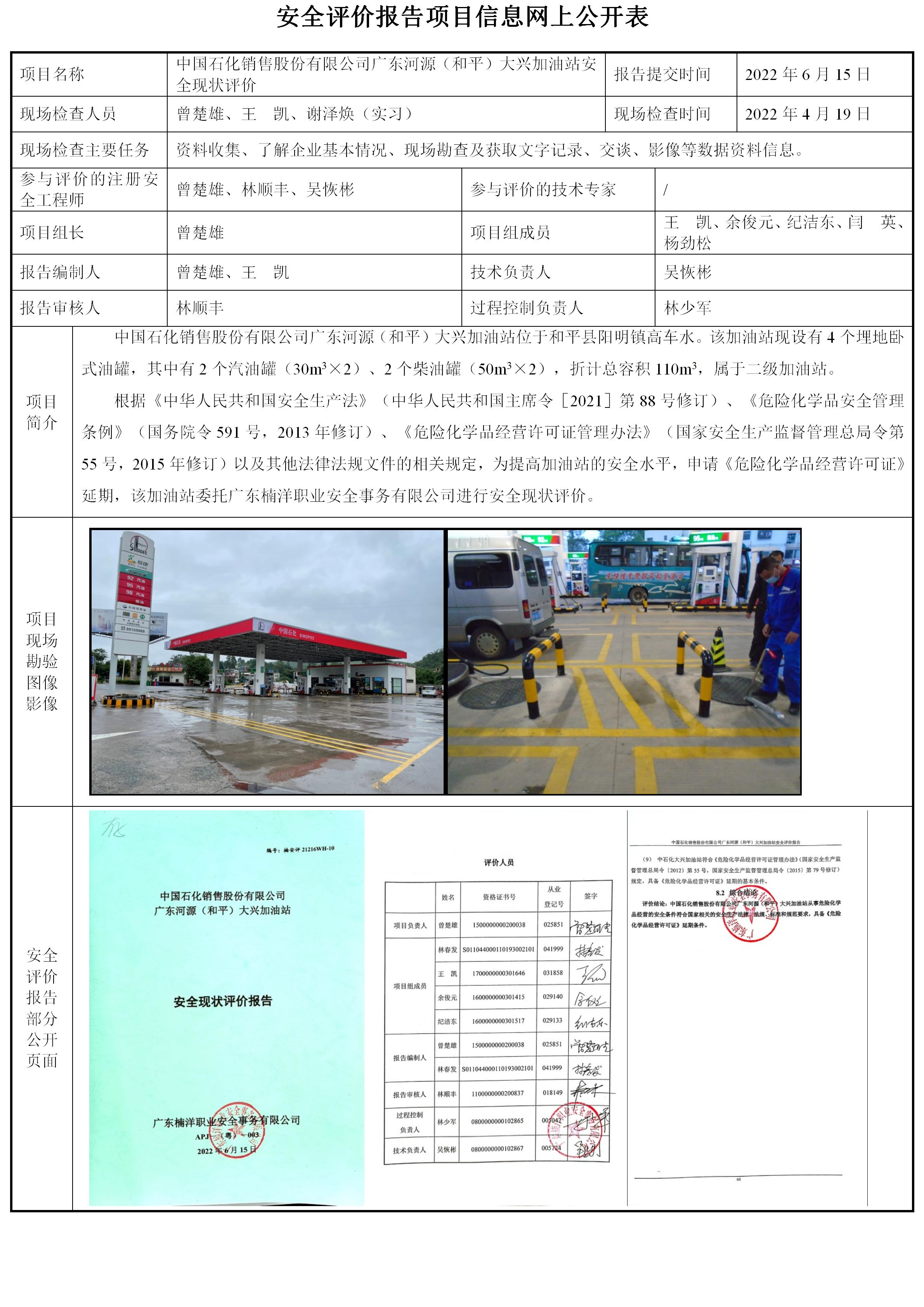 中国石化销售股份有限公司广东河源(和平)大兴加油站安全现状评价