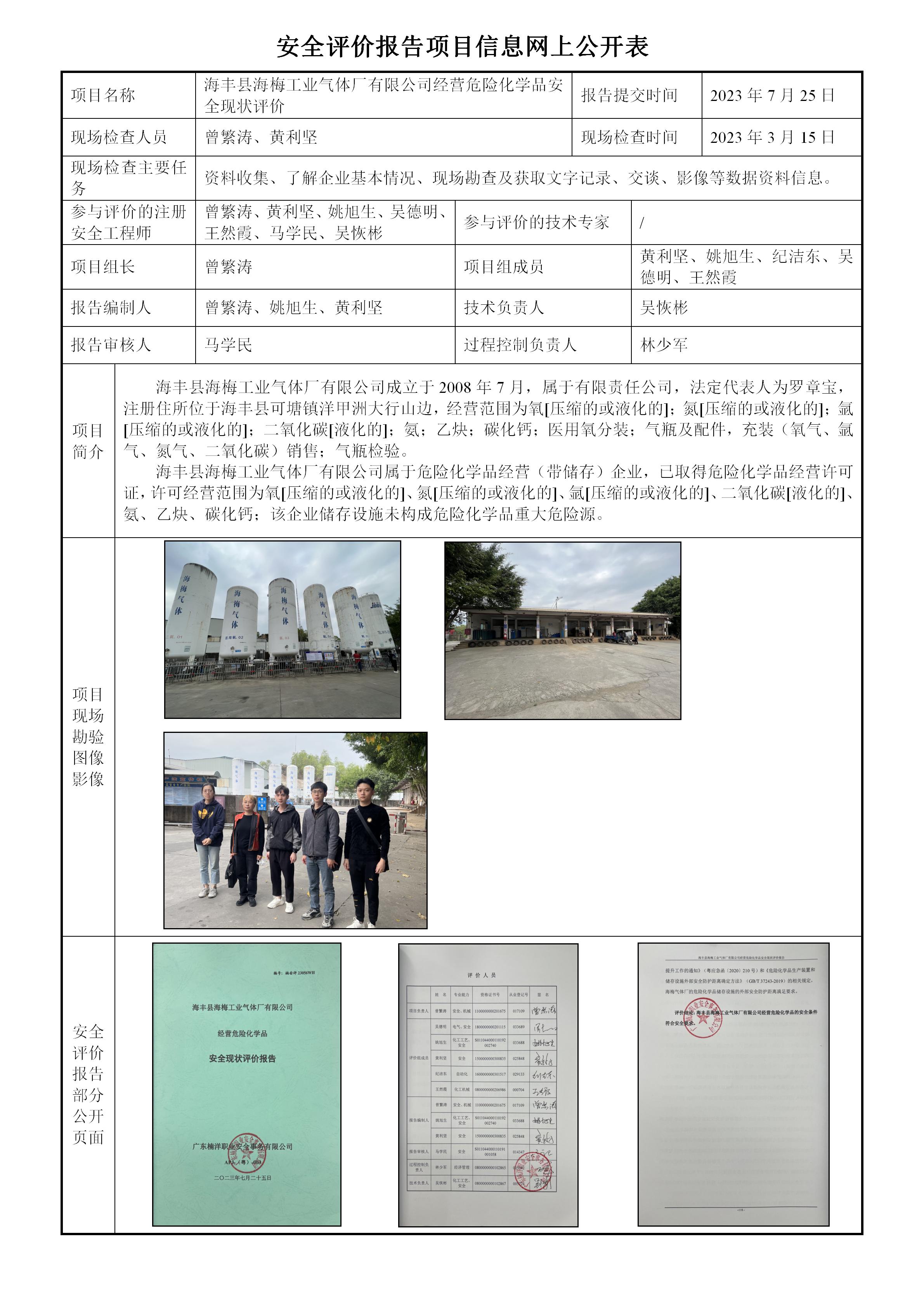 海丰县海梅工业气体厂有限公司经营危险化学品安全现状评价