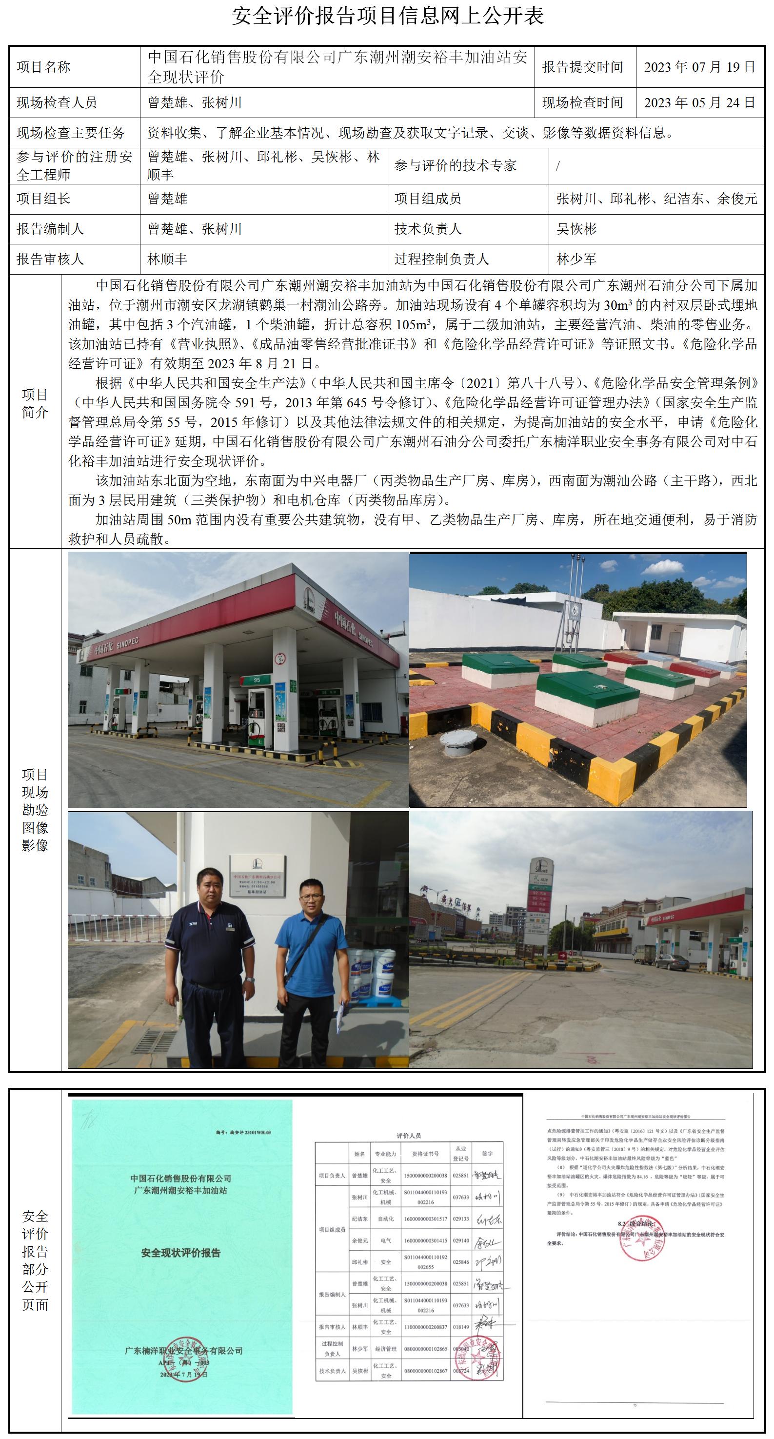 中国石化销售股份有限公司广东潮州潮安裕丰加油站安全现状评价