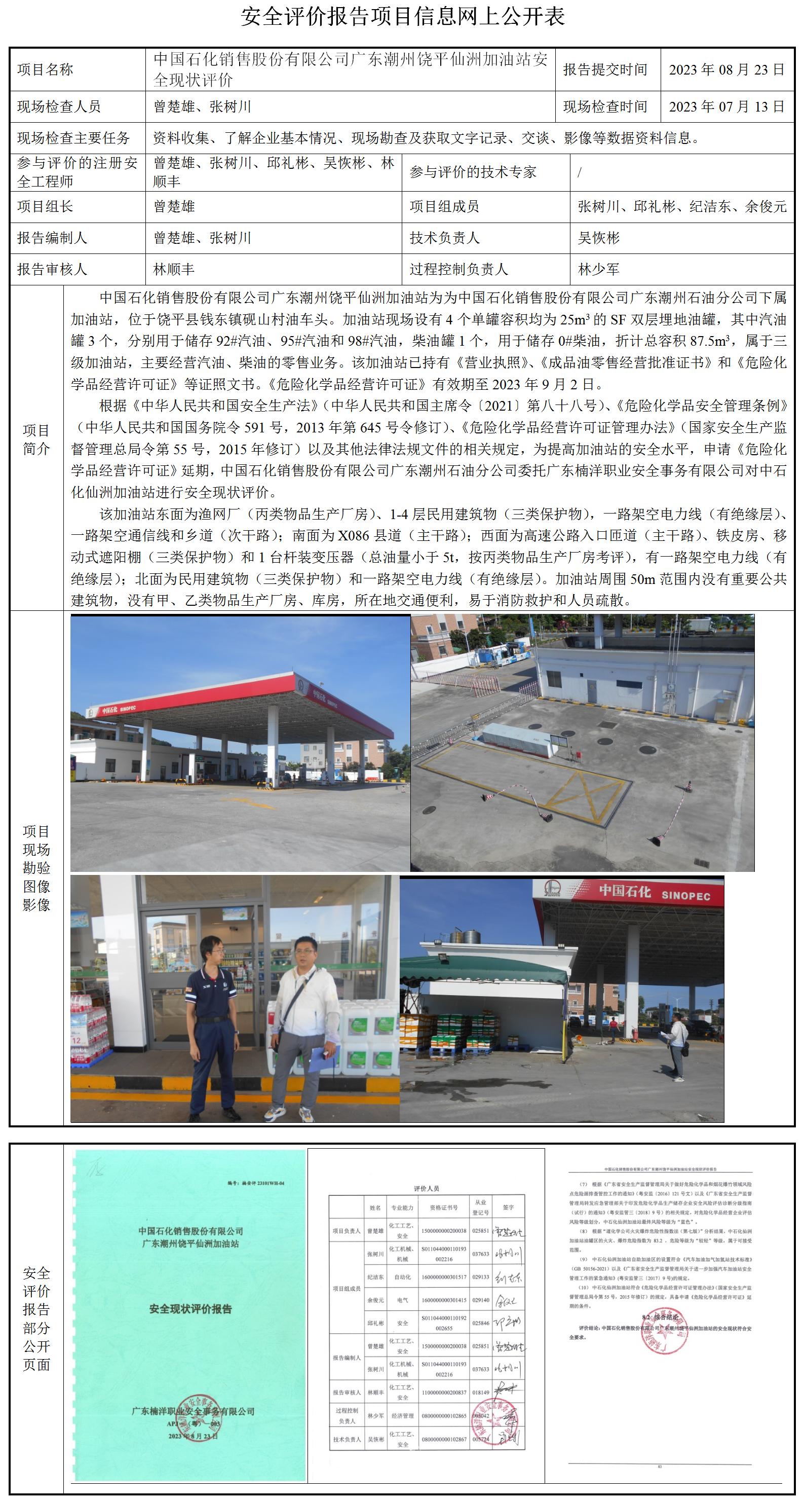 中国石化销售股份有限公司广东潮州饶平仙洲加油站安全现状评价