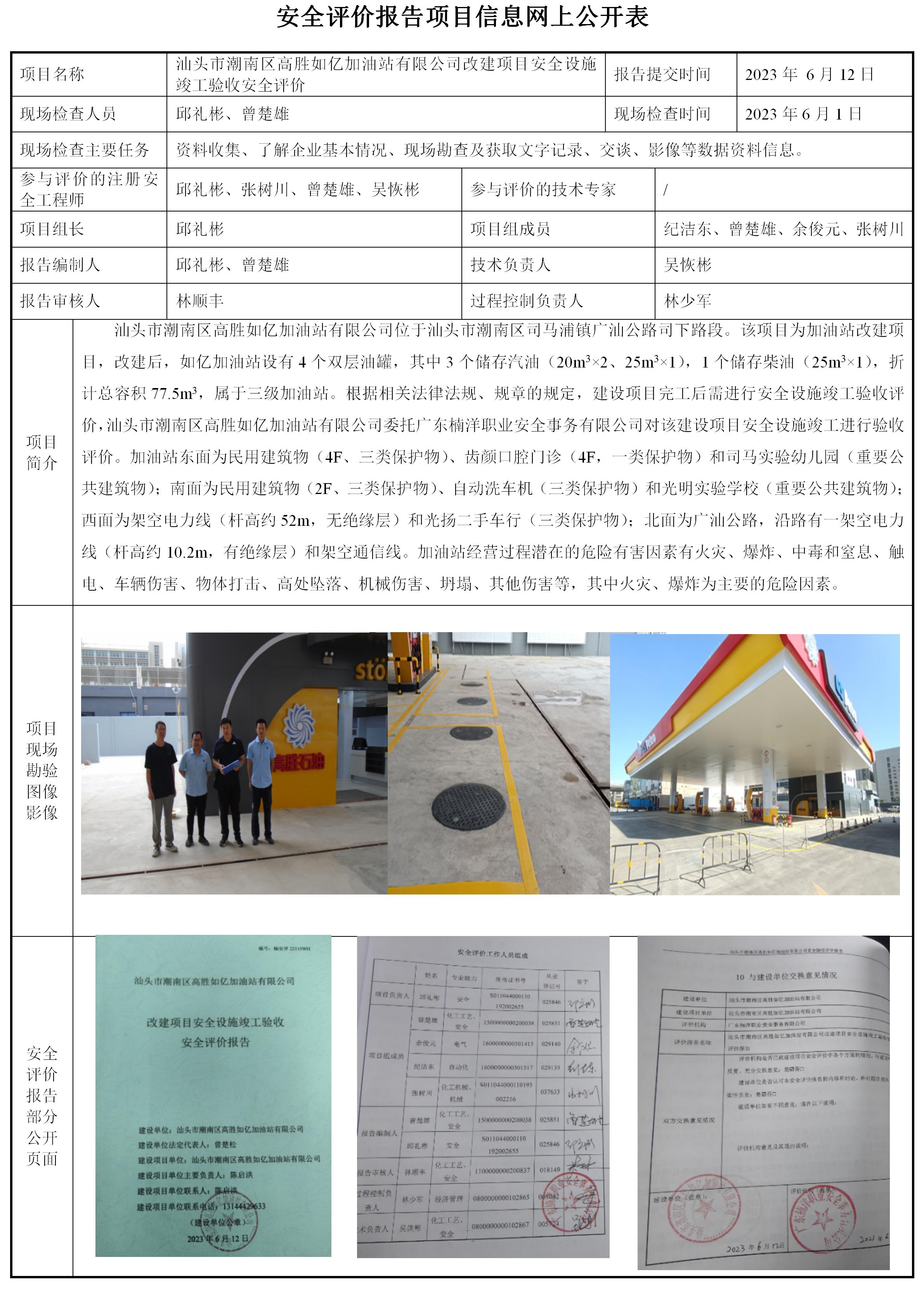 汕头市潮南区高胜如亿加油站有限公司改建项目安全设施竣工验收安全评价