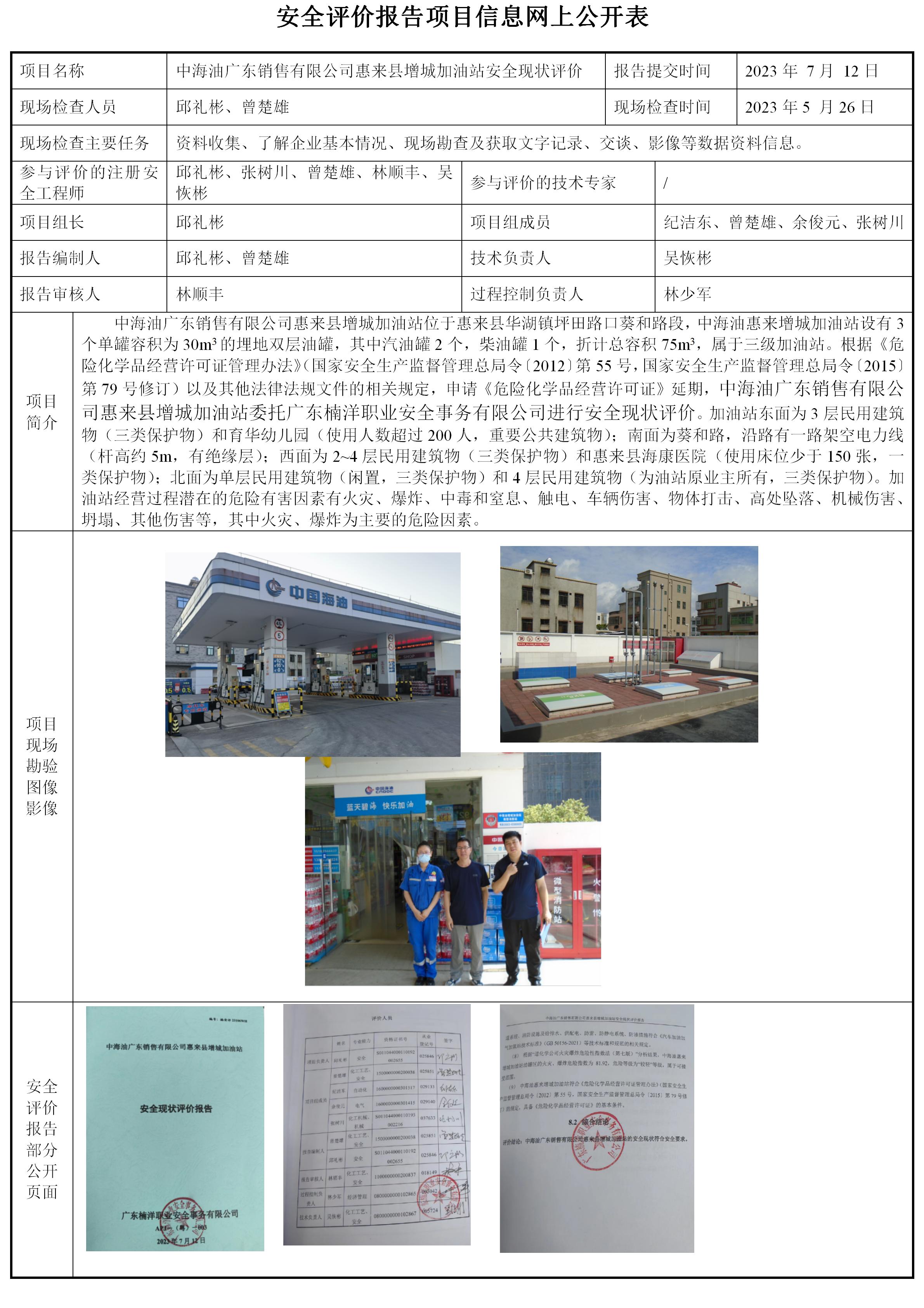 中海油广东销售有限公司惠来县增城加油站安全现状评价