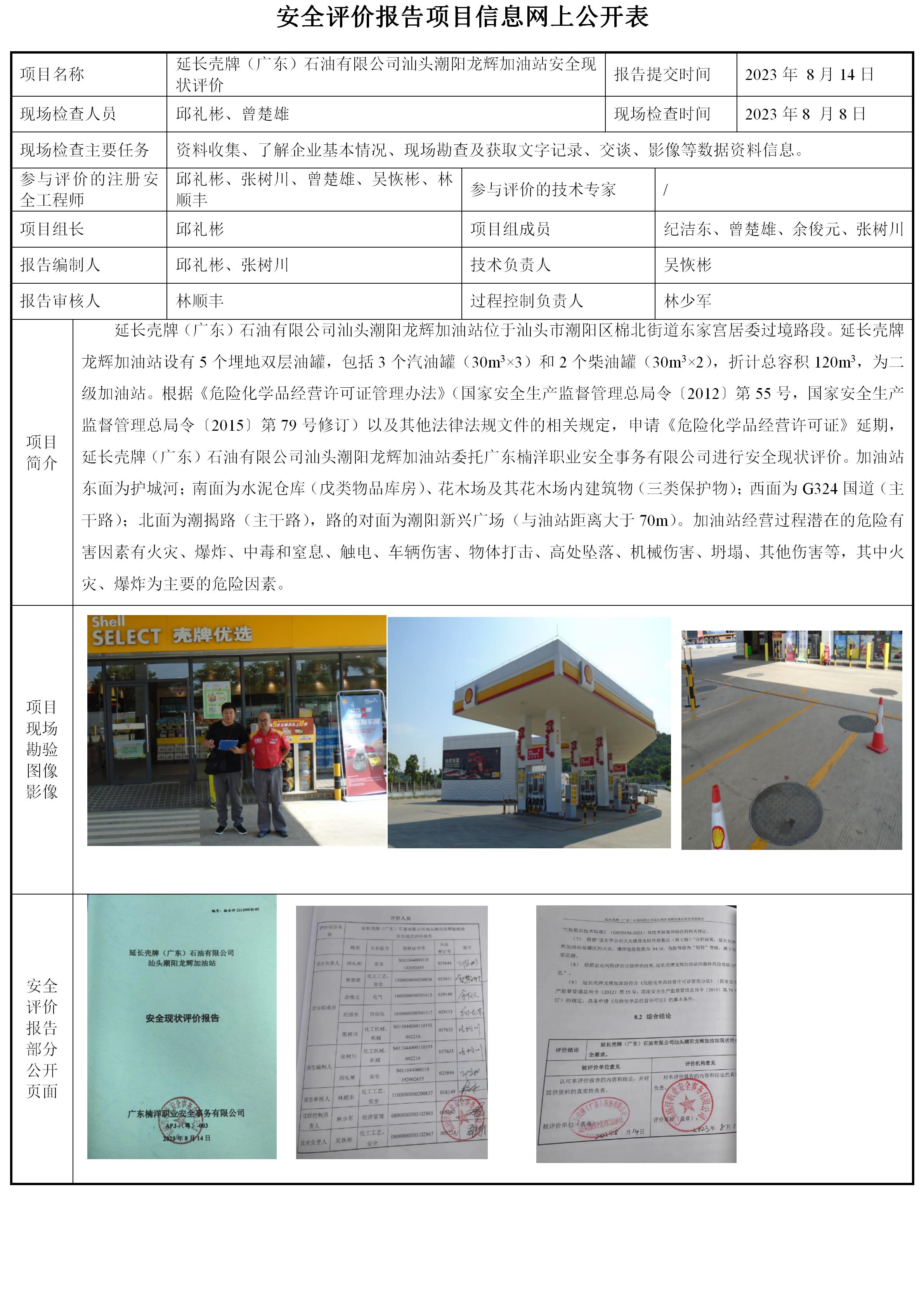 延长壳牌(广东)石油有限公司汕头潮阳龙辉加油站安全现状评价