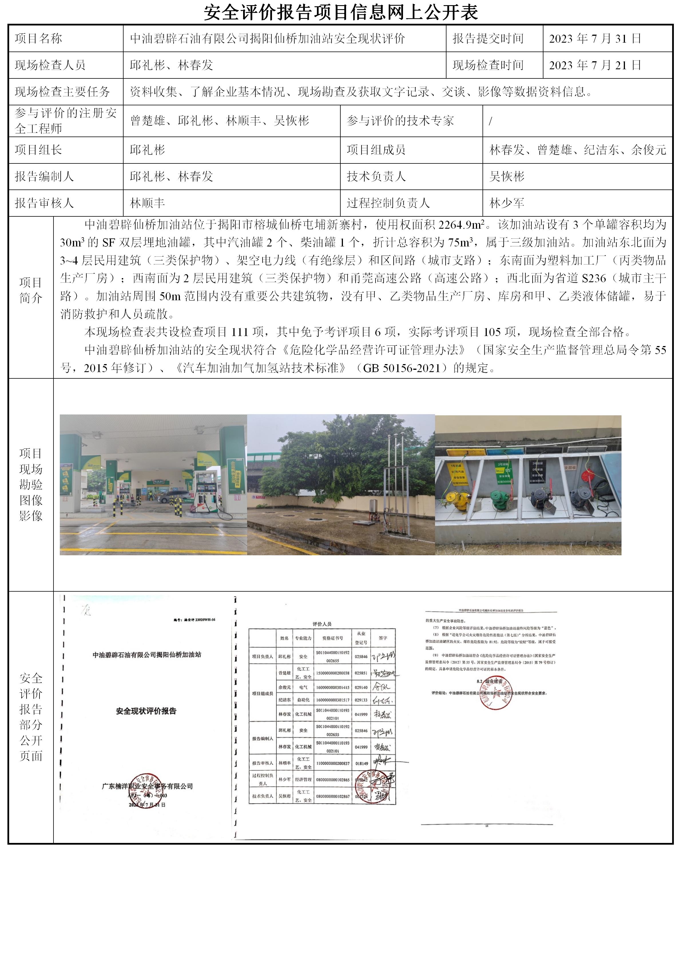 中油碧辟石油有限公司揭阳仙桥加油站安全现状评价