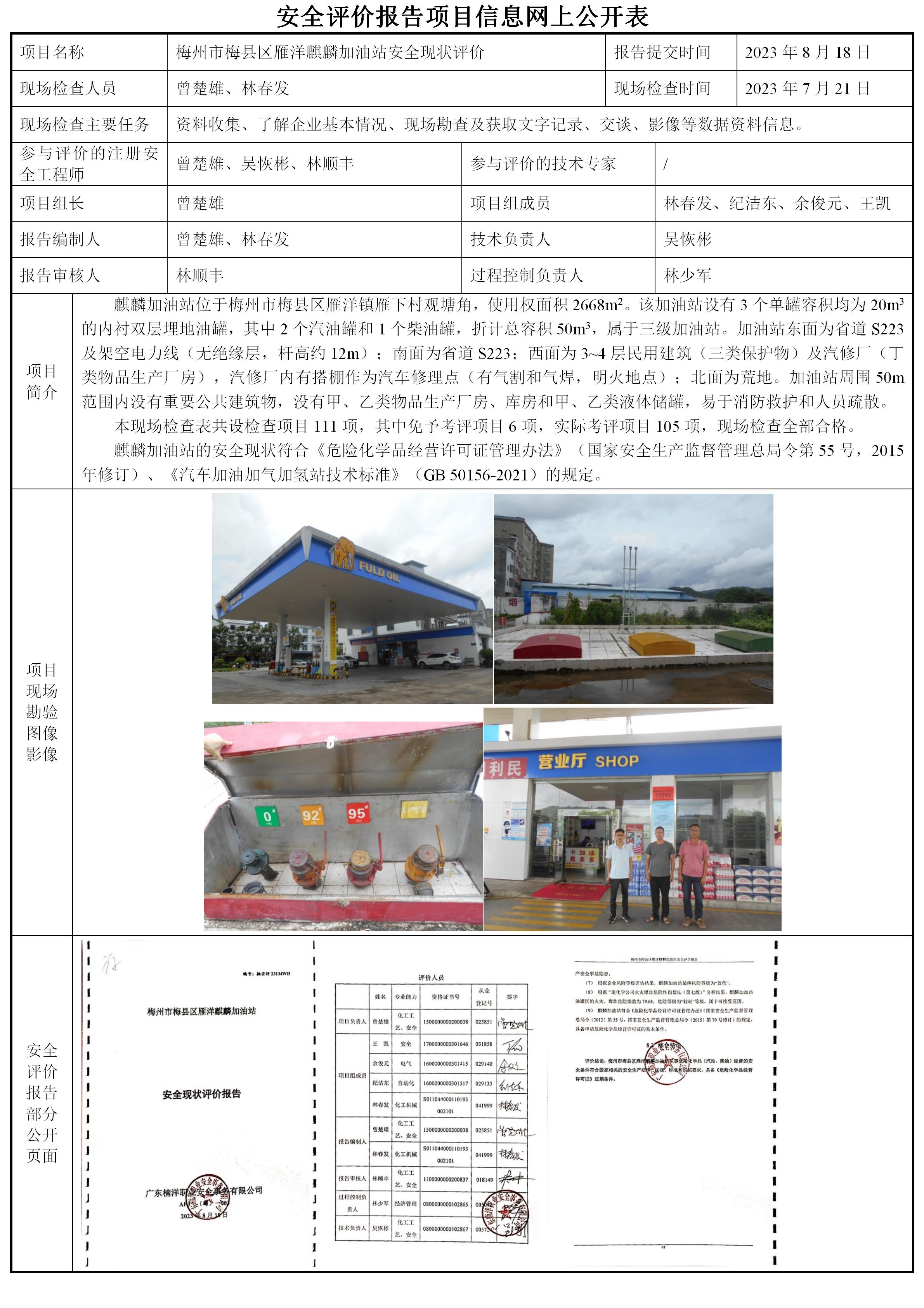 梅州市梅县区雁洋麒麟加油站安全现状评价