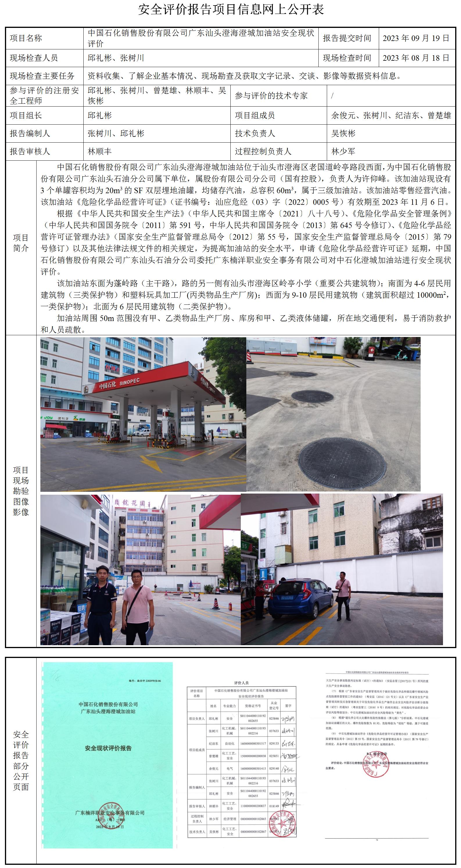 中国石化销售股份有限公司广东汕头澄海澄城加油站安全现状评价