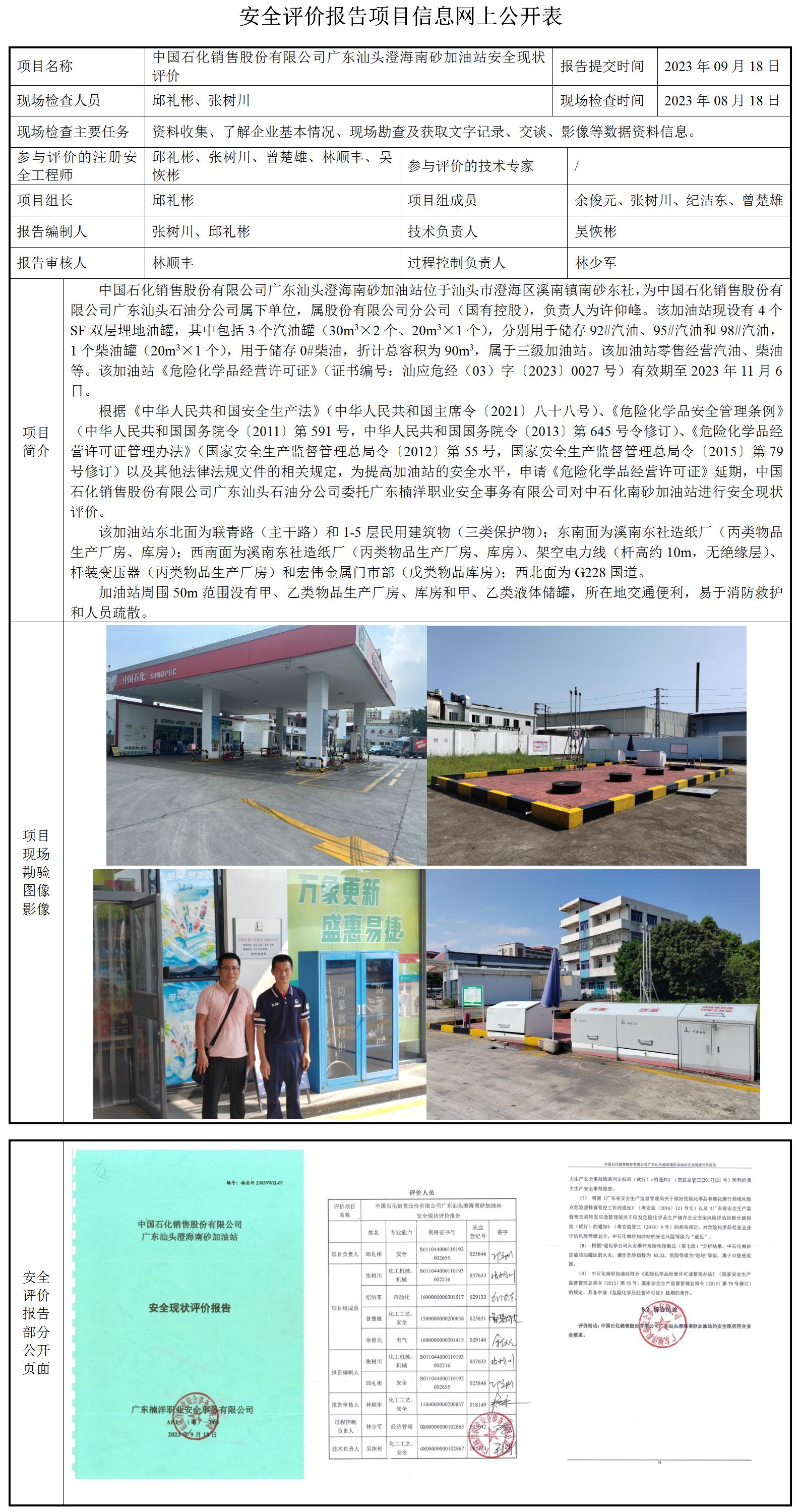 中国石化销售股份有限公司广东汕头澄海南砂加油站安全现状评价