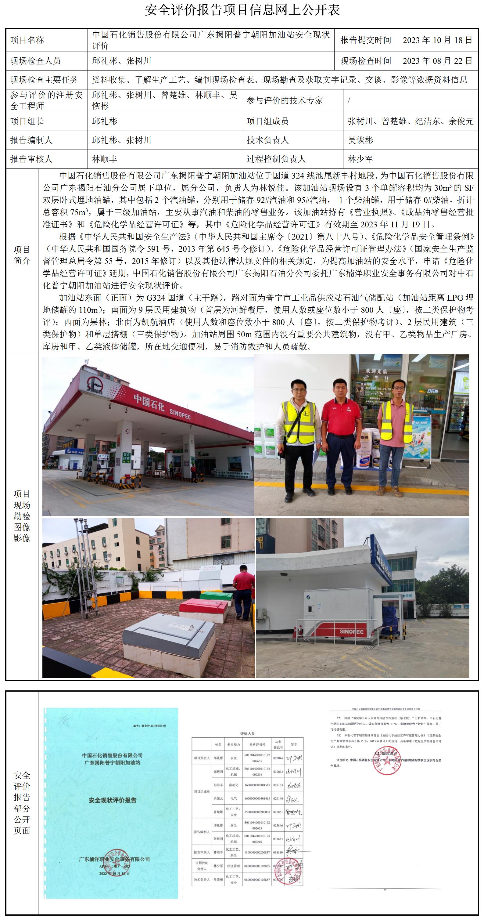 中国石化销售股份有限公司广东揭阳普宁朝阳加油站安全现状评价