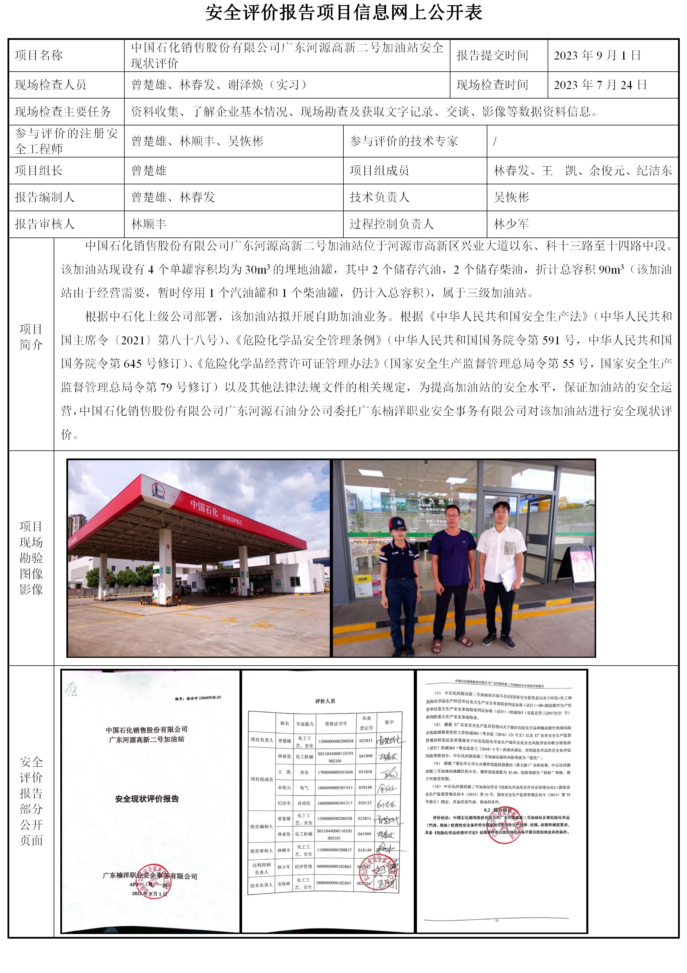 中国石化销售股份有限公司广东河源高新二号加油站安全现状评价