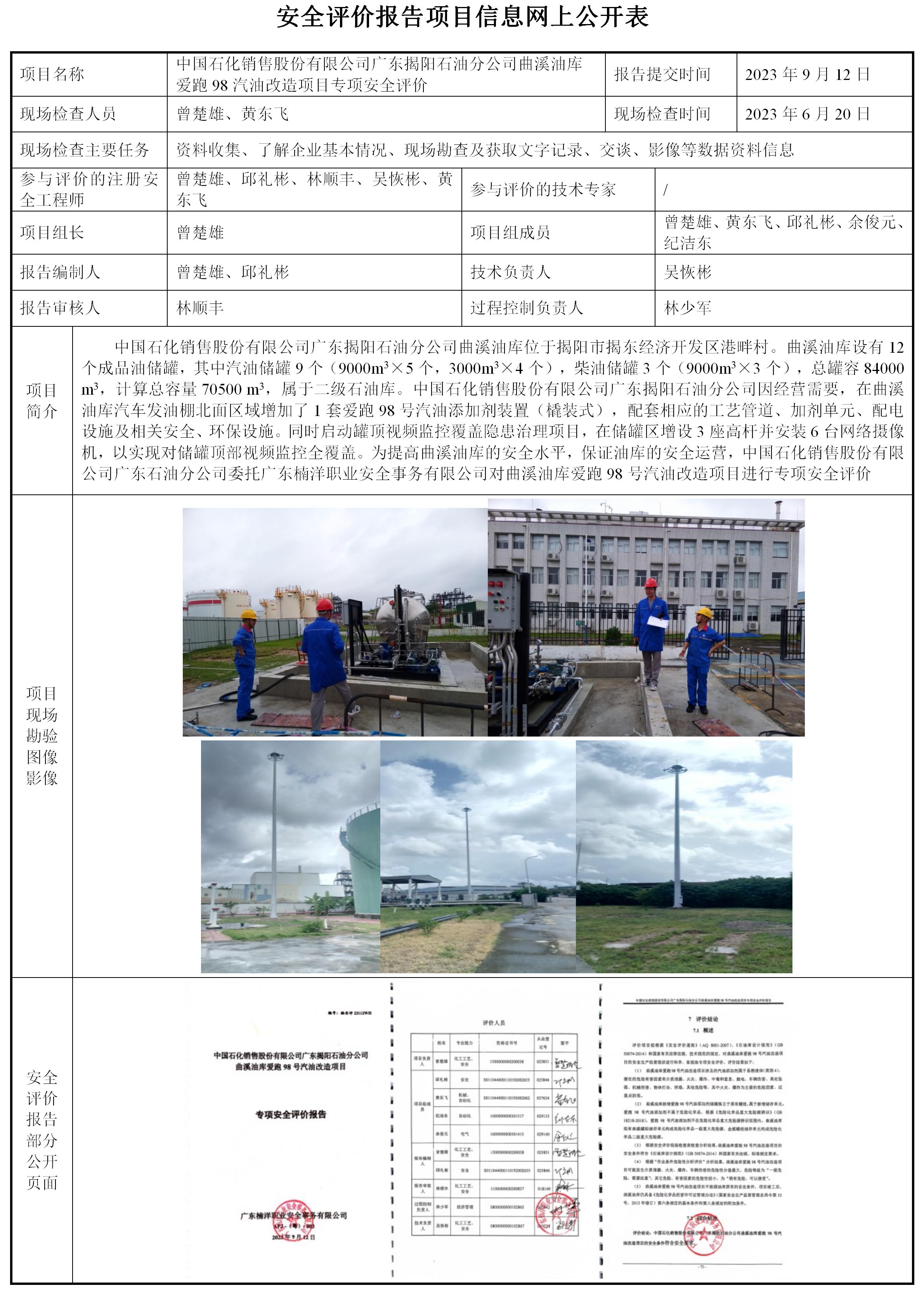 中国石化销售股份有限公司广东揭阳石油分公司曲溪油库爱跑98号汽油改造项目专项安全评价