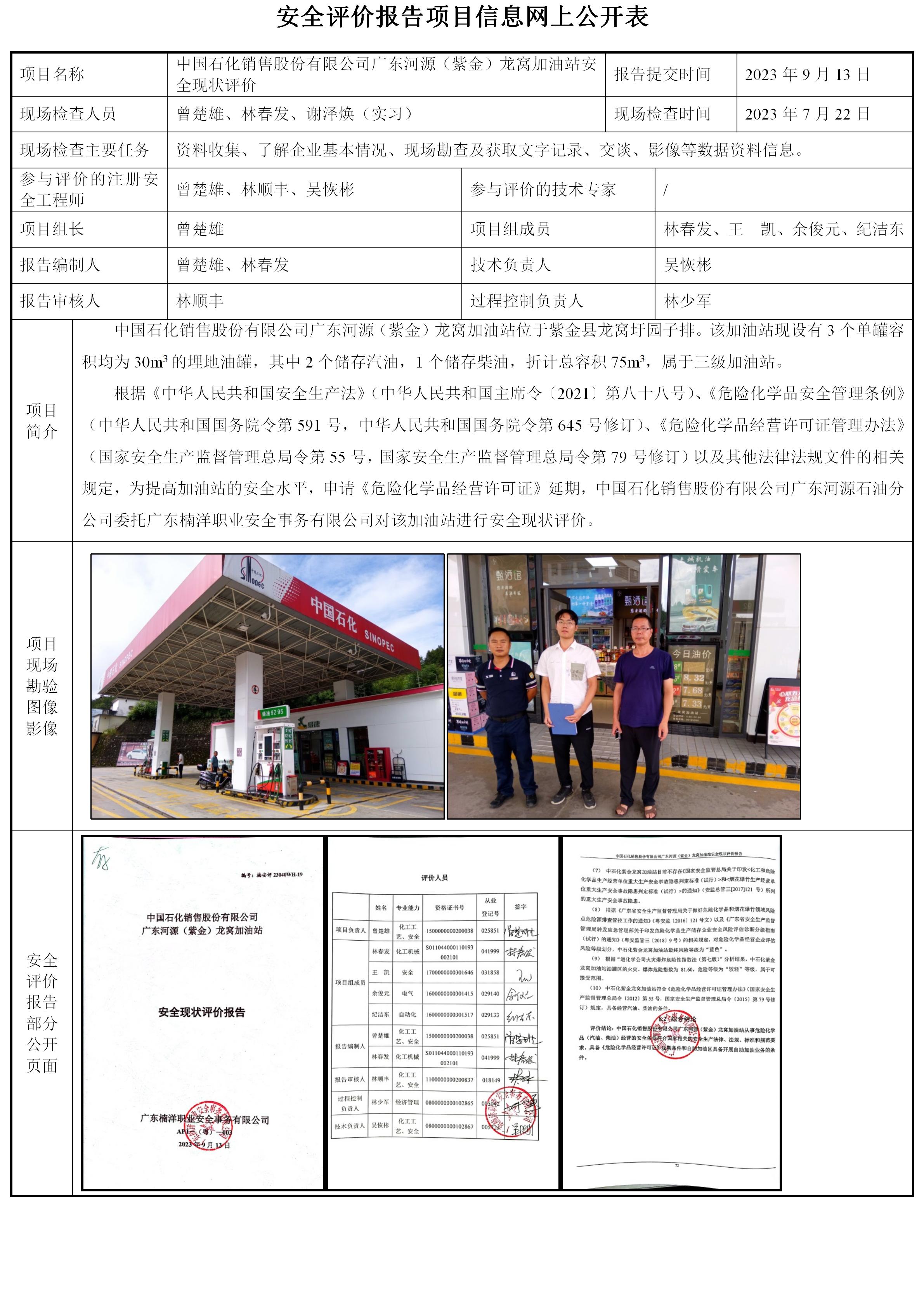 中国石化销售股份有限公司广东河源(紫金)龙窝加油站安全现状评价