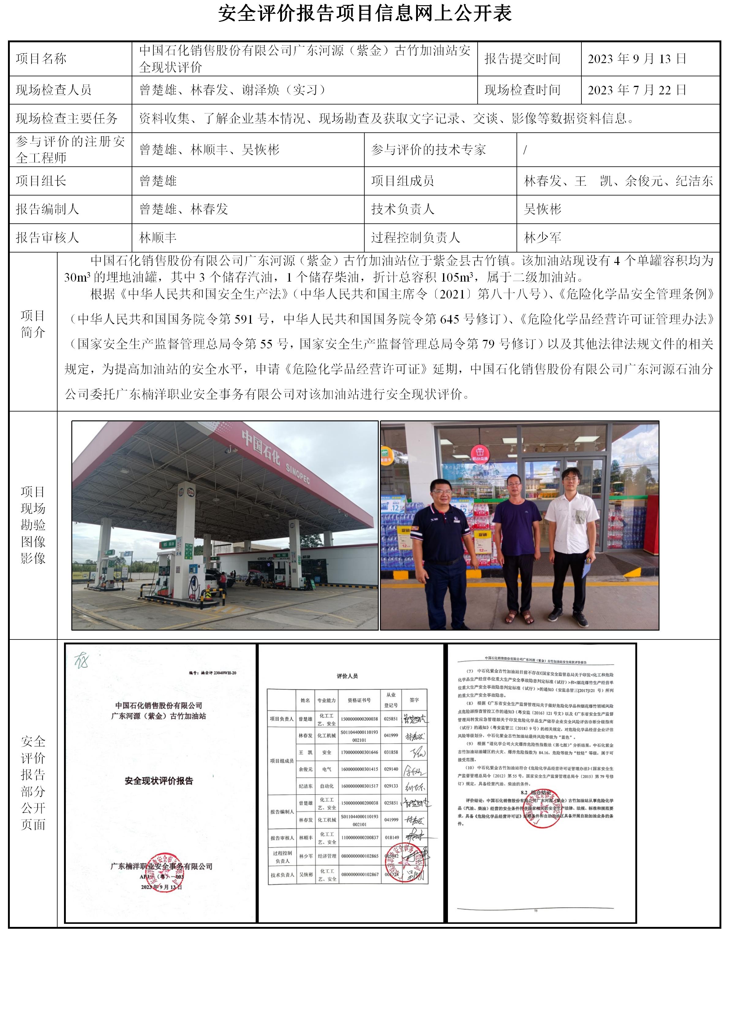 中国石化销售股份有限公司广东河源(紫金)古竹加油站安全现状评价